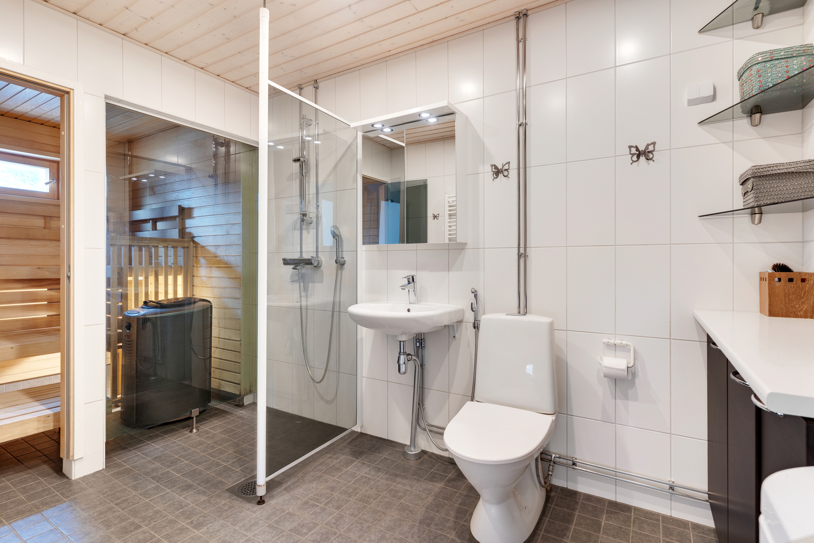 Kylpyhuoneessa on oma sauna ja kodinhoitopiste.