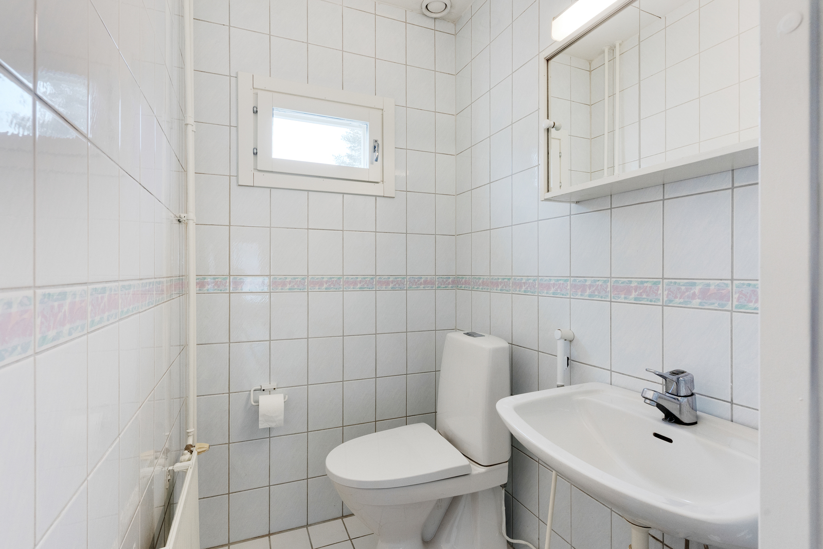 | Kylpyhuoneen kuvaus | Pesukoneliitäntä, suihkuseinä, wc-istuin, allaskaappi, lattialämmitys, peilikaappi, suihku ja asennettuja erikoisvarusteita, seinät (kaakeli), lattiat (laatta) |