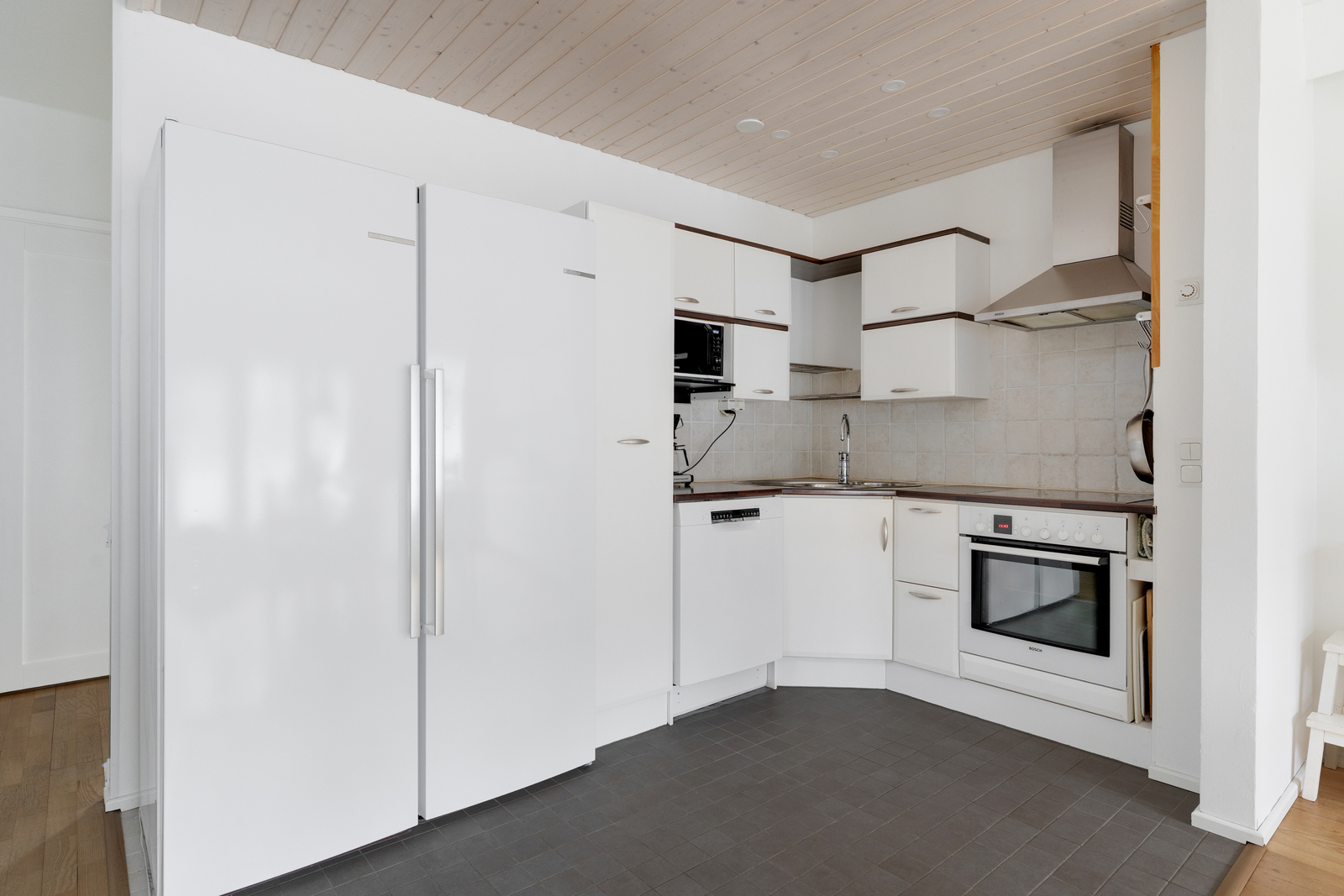 | Keittiön kuvaus | Liesi (Keraaminen liesi ja muu), työtasot (laminaatti), seinät (maali), lattiat (laatta), liesi, liesituuletin, jääkaappi, astianpesukone, erillinen pakastin ja kiinteät valaisimet, keittiön välitila: laatta keittiössä valkoiset kaapistot lattiassa: harmaa laatta sekä lattialämmitys (uuni toimii vain kiertoilmalla, lieden kolme pistettä toimii) |