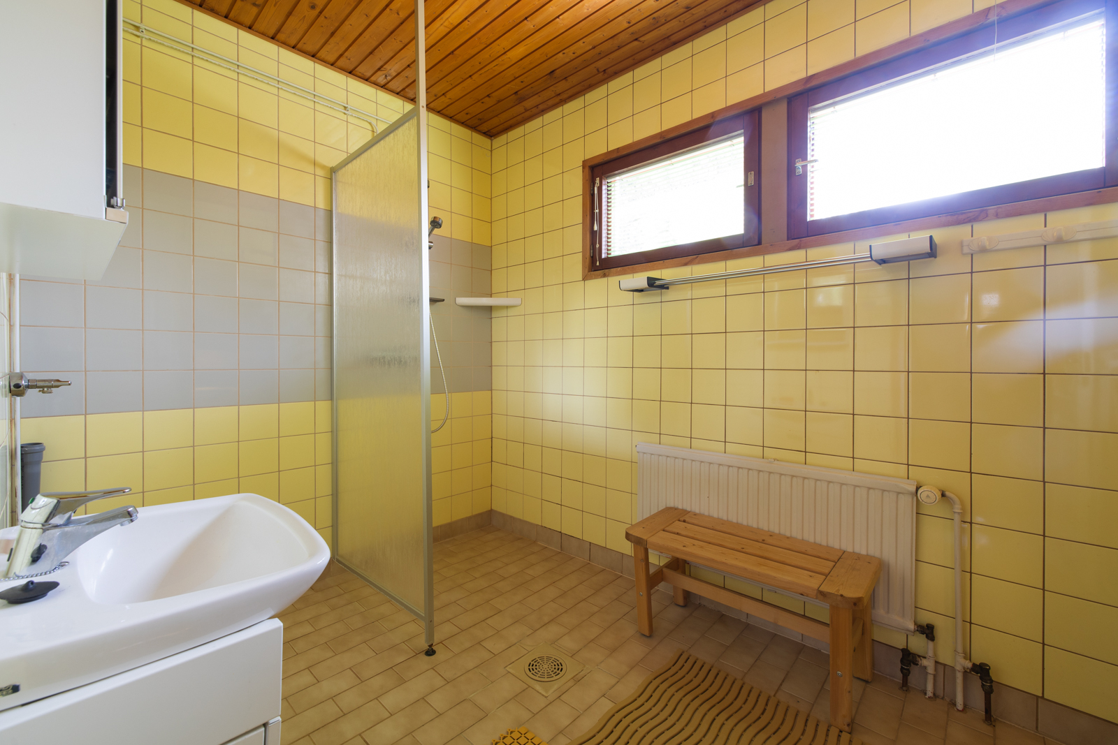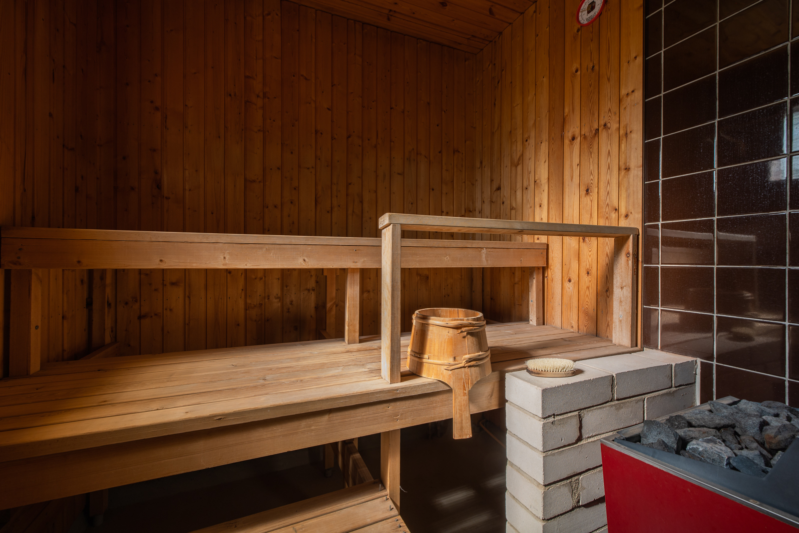Seinät (puu), lattiat (betoni), Sähkökiuas |