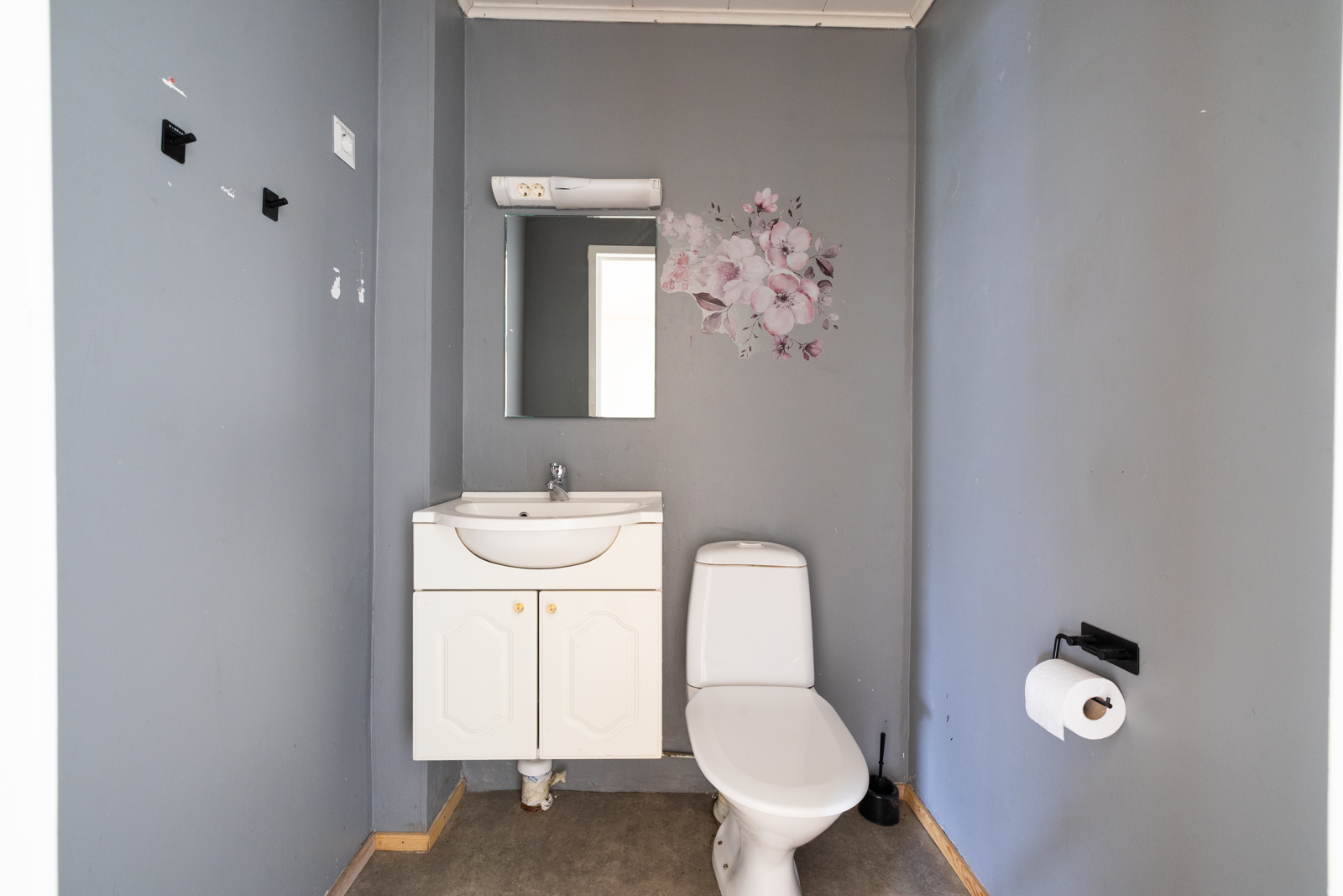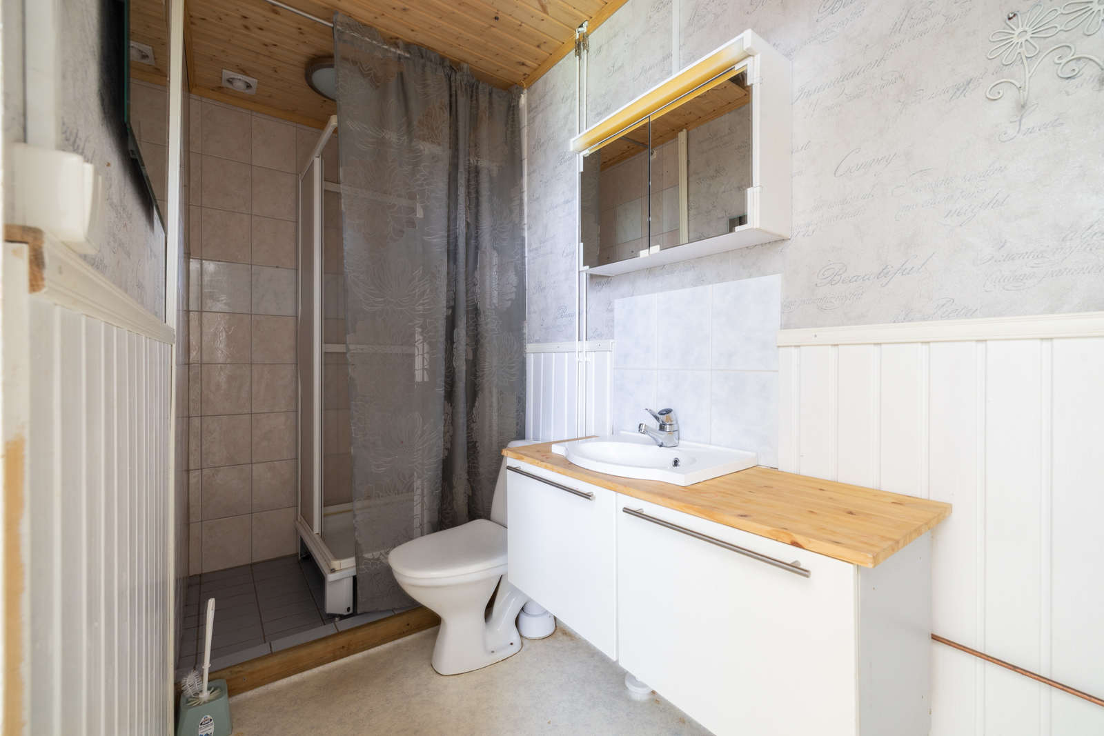 | WC-tilojen kuvaus | Lukumäärä: 1, WC-istuin, allaskaappi ja peili, seinät (Maali), lattiat (Muovimatto) |