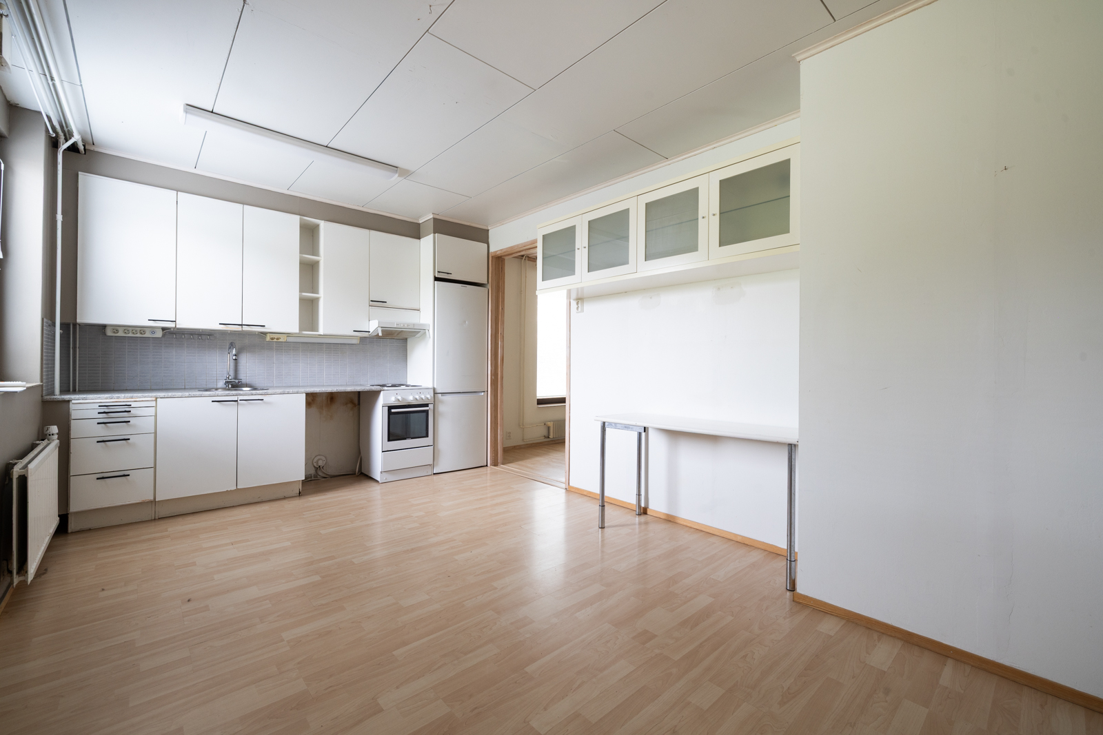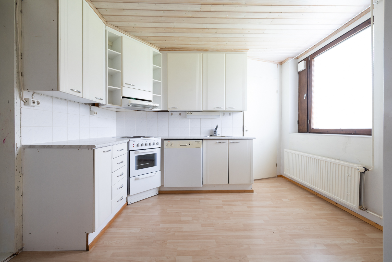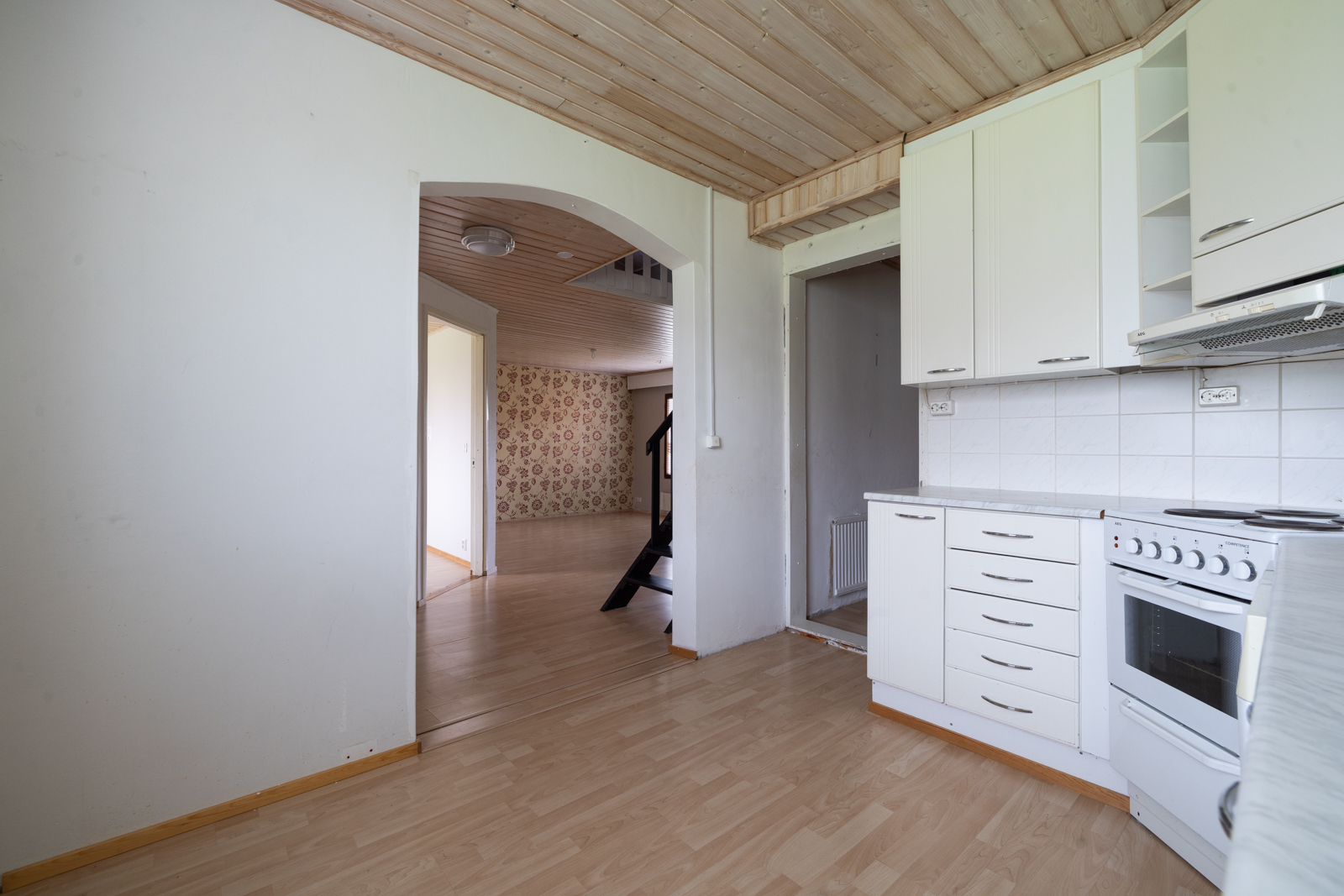 | Keittiön kuvaus | Liesi (Sähköhella), työtasot (laminaatti), seinät (maali), lattiat (laminaatti), astianpesukone (Astianpesukone talon toisessa keittiössä ja toisessa keittiössä apk-liitäntä), jääkaappipakastin, liesi ja liesituuletin |