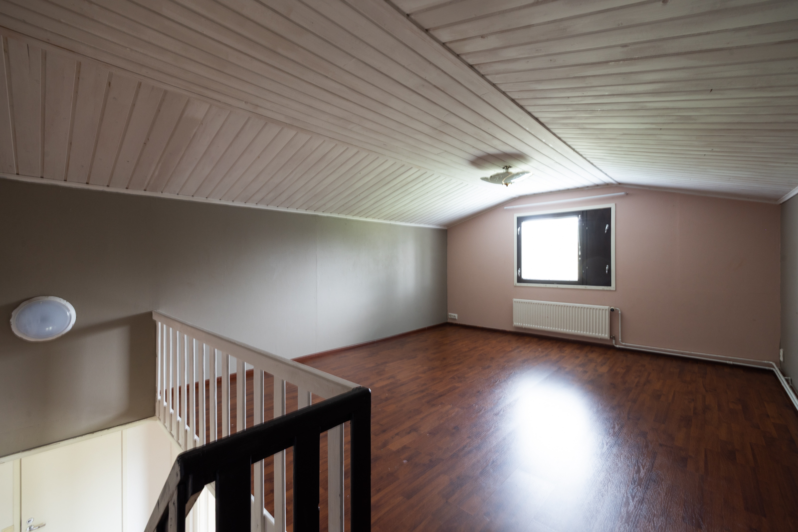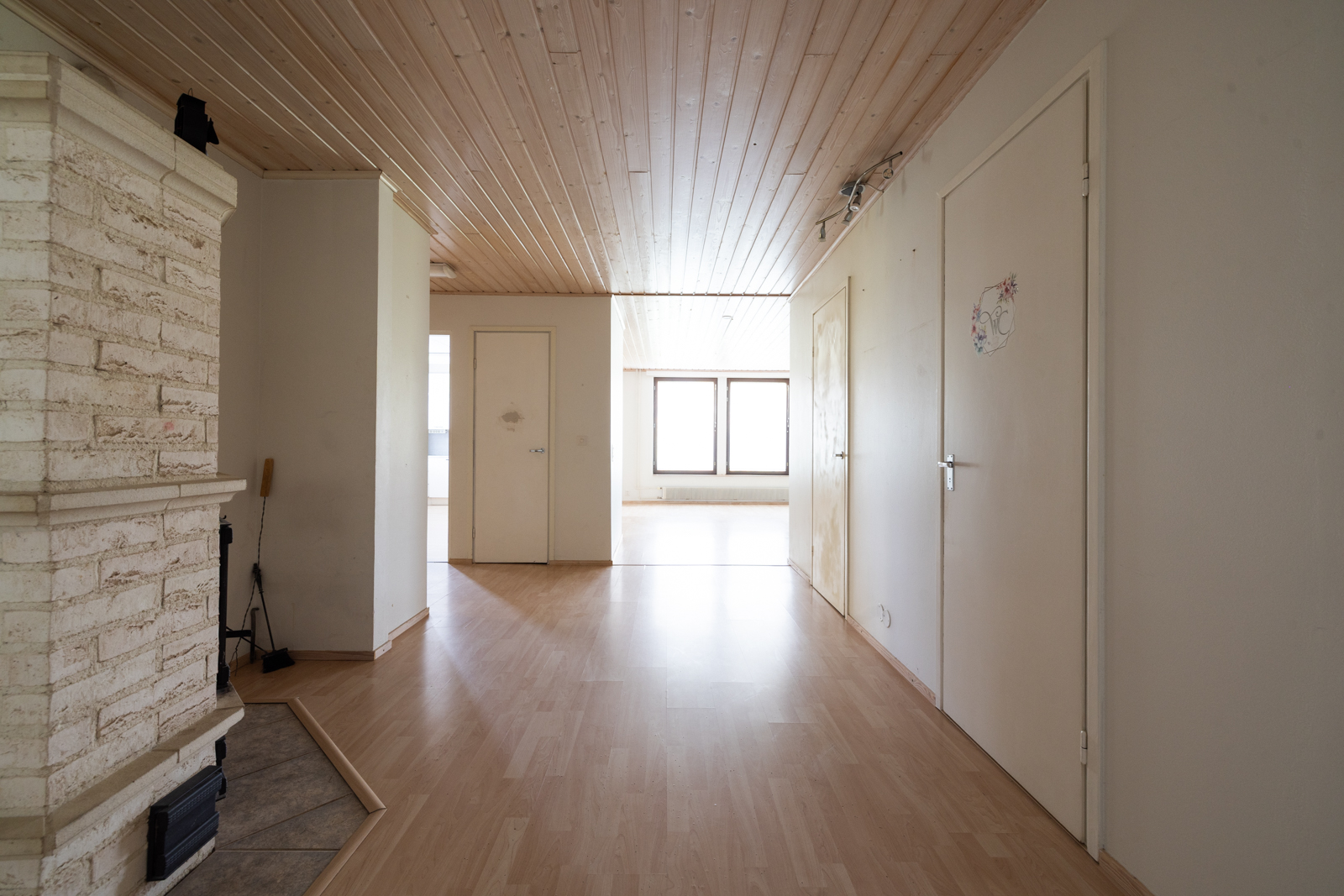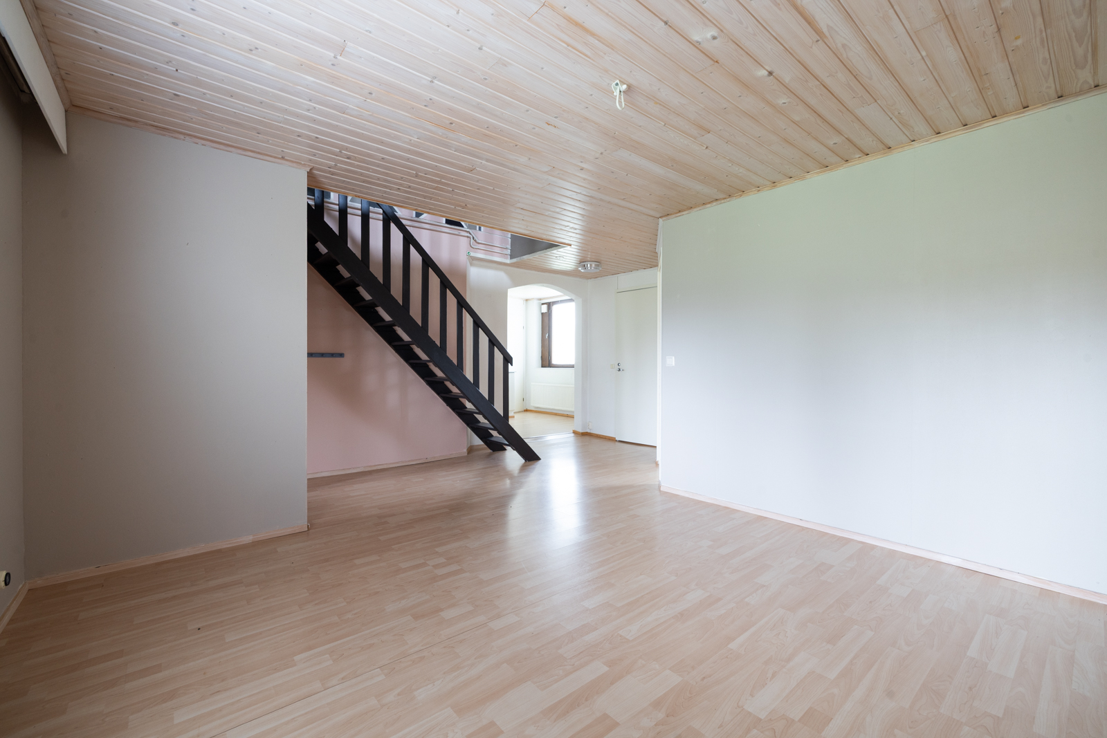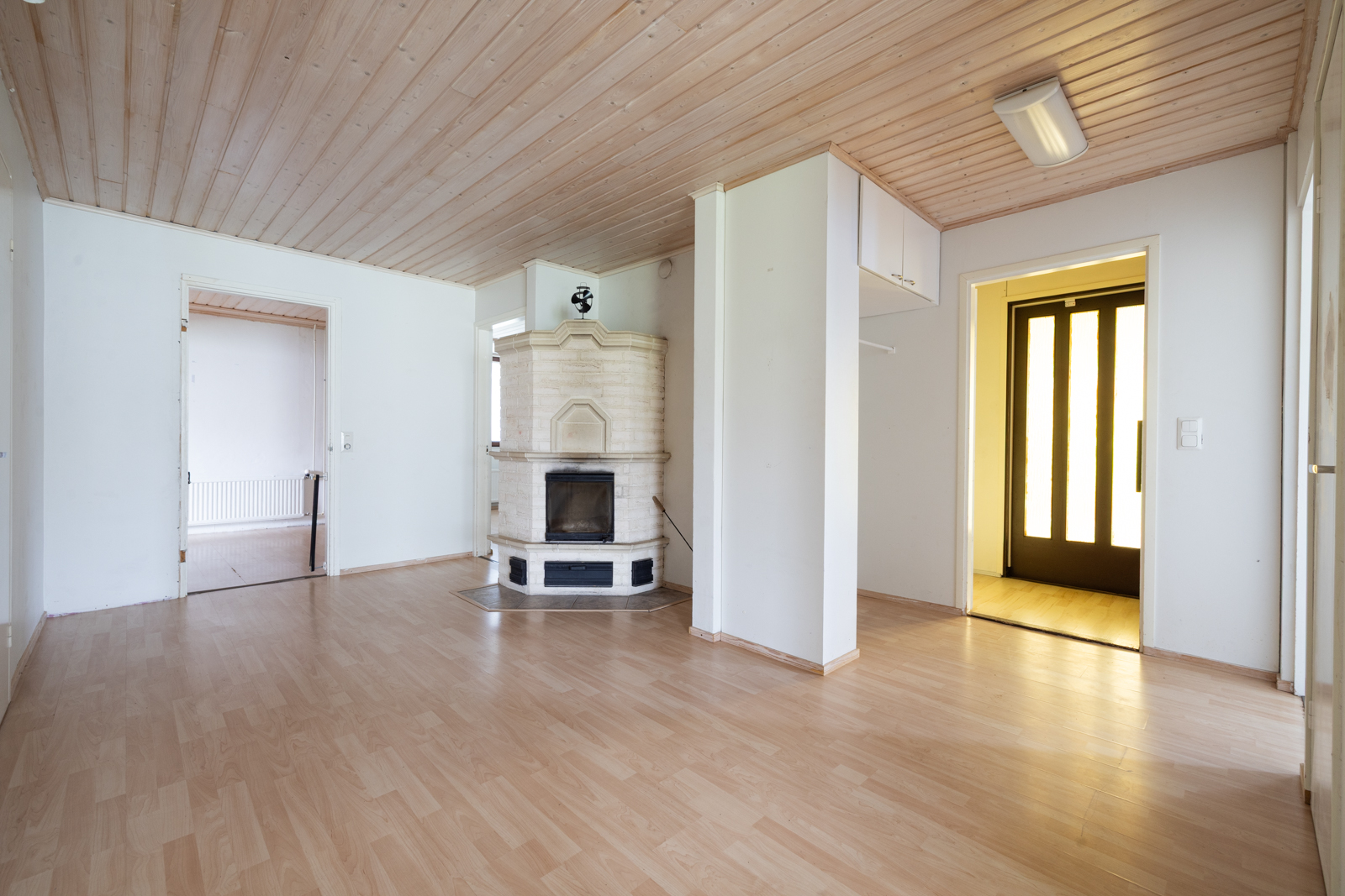 | Kattomateriaalin kuvaus | Tuulikaapin, Eteisen, työhuoneen ja parven katto valkolakattua puupaneelia. |