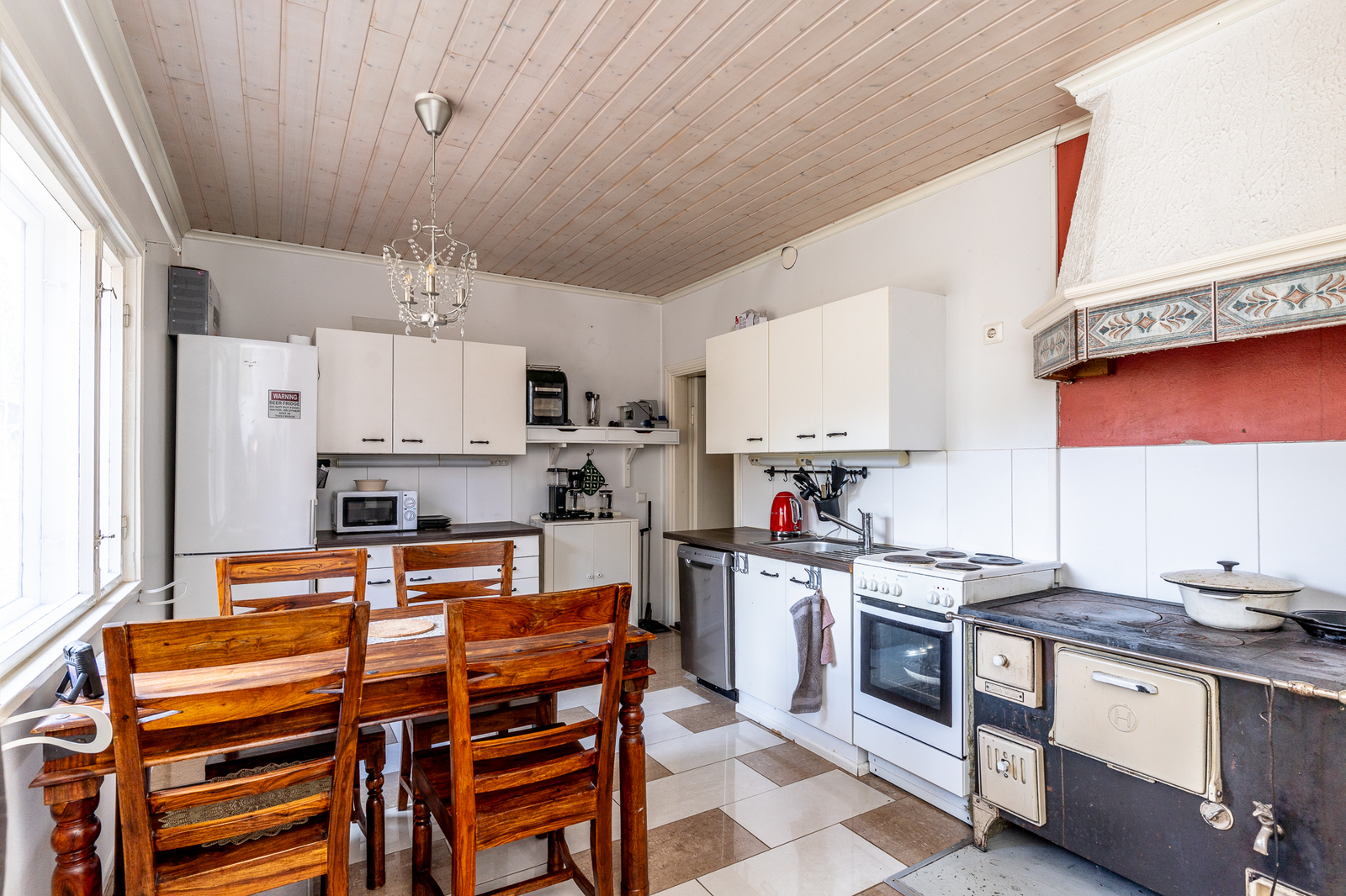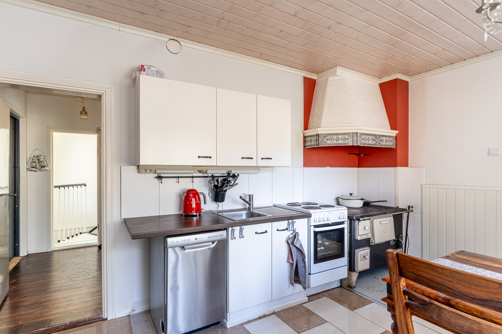 Keittiön kuvaus Liesi (puuliesi, sähköliesi), työtasot (laminaatti), seinät (laatta ja maali), lattiat (laatta), jääkaappipakastin, liesi ja varattu paikka astianpesukoneelle