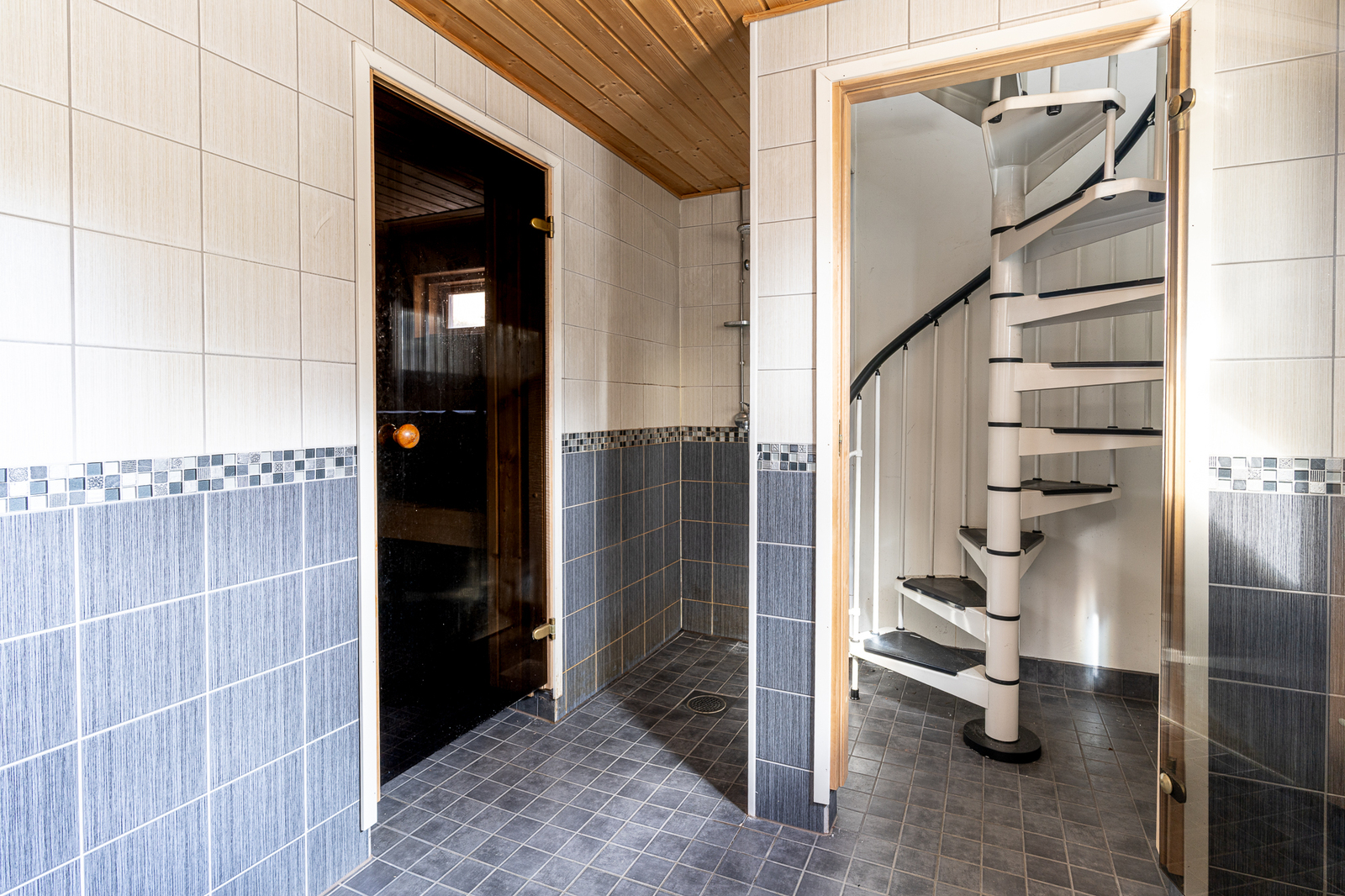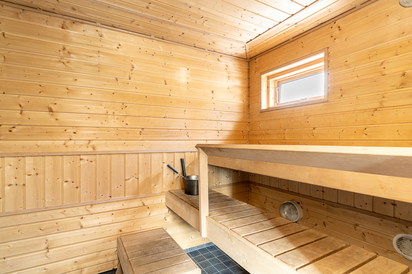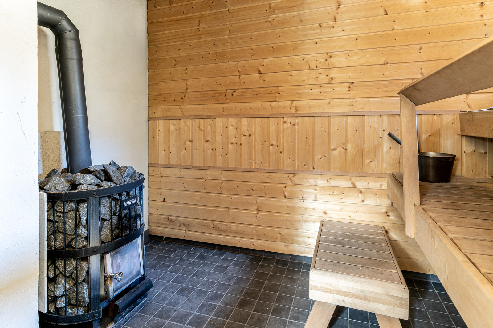 Saunan kuvaus Seinät (puu), lattiat (laatta), Puukiuas
