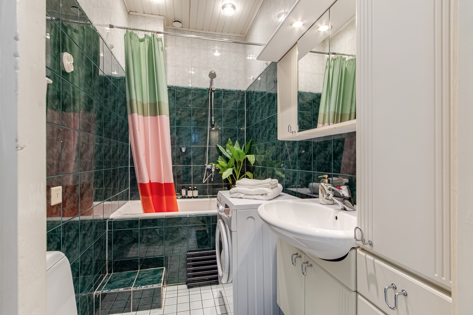 | Kylpyhuoneen kuvaus | Pesukoneliitäntä, wc-istuin, allaskaappi, lattialämmitys, peilikaappi, kylpyamme, suihku ja kiinteät valaisimet, seinät (kaakeli), lattiat (laatta) |