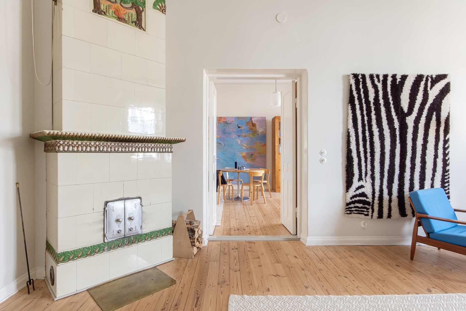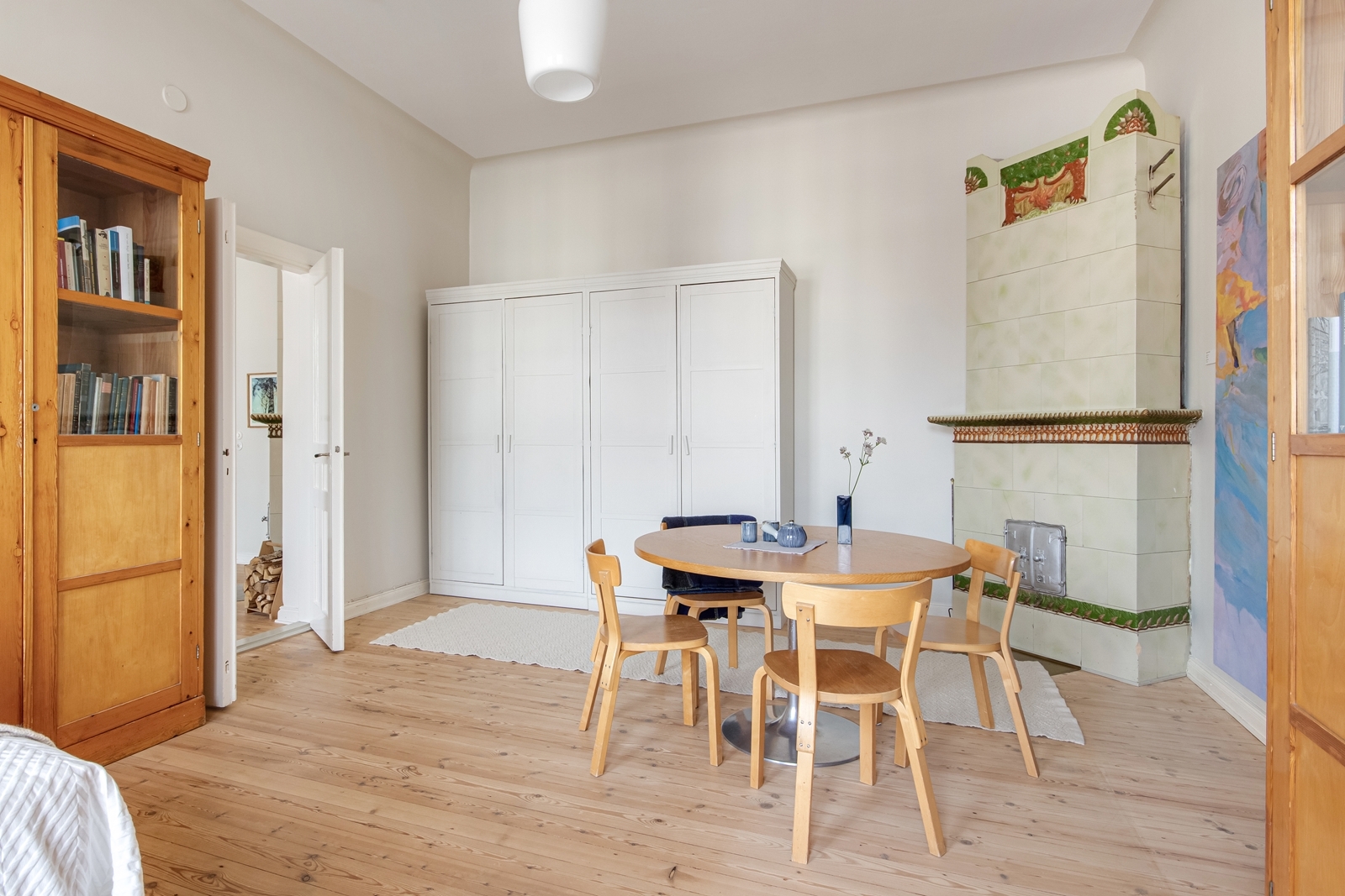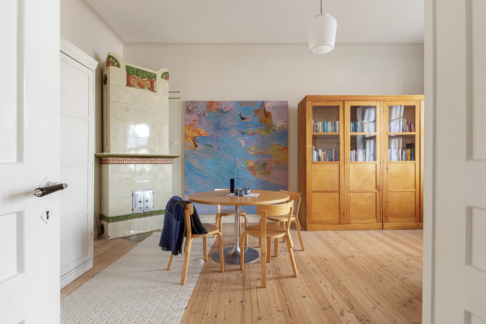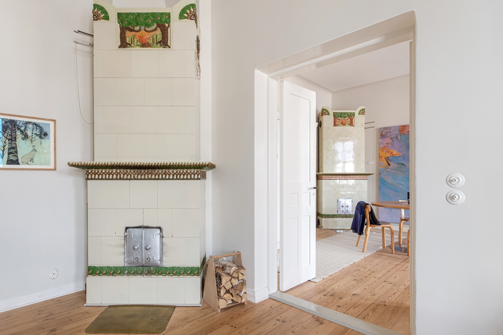 Huoneistossa on kaksi kaunista kakluunia, jotka tuovat tunnelmaa ja lämpöä talvikausina. Lisäksi keittiössä on vesikiertoinen lattialämmitys, joka lisää asumismukavuutta. Keittiö itsessään on todellinen helmi – sisustusarkkitehdin suunnittelemat ja artesaanipuusepän toteuttamat saarnikaapistot yhdistyvät tyylikkäisiin diabaasi-kivitasoihin.