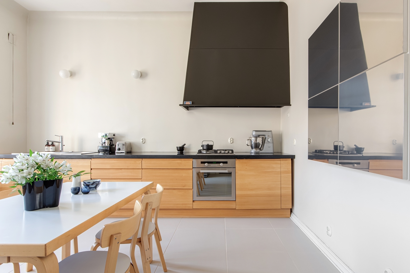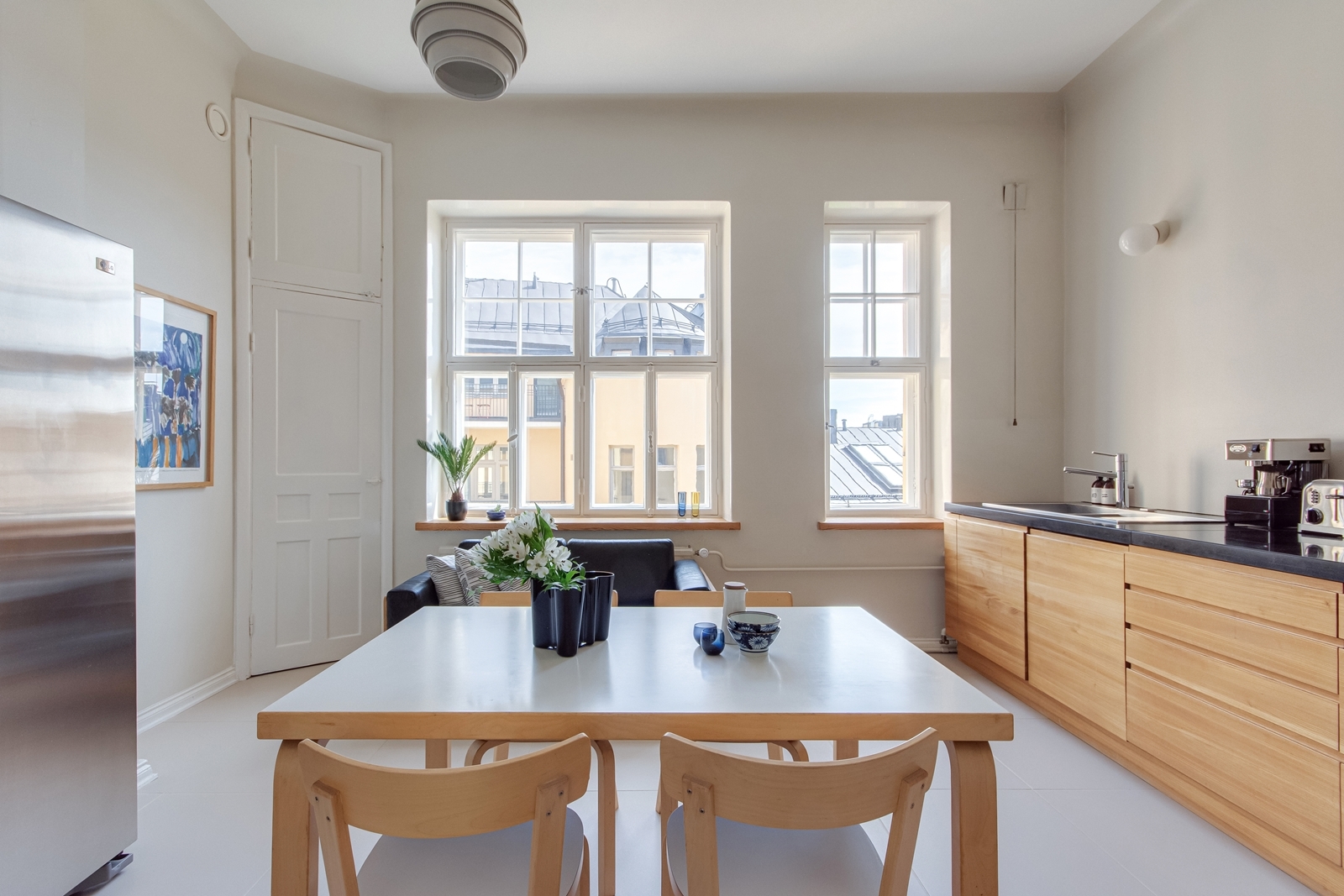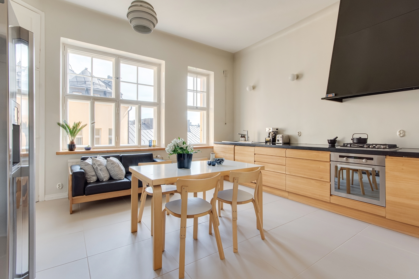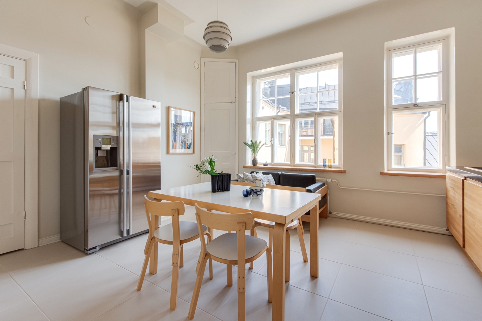 Huoneistossa on kaksi kaunista kakluunia, jotka tuovat tunnelmaa ja lämpöä talvikausina. Lisäksi keittiössä on vesikiertoinen lattialämmitys, joka lisää asumismukavuutta. Keittiö itsessään on todellinen helmi – sisustusarkkitehdin suunnittelemat ja artesaanipuusepän toteuttamat saarnikaapistot yhdistyvät tyylikkäisiin diabaasi-kivitasoihin.