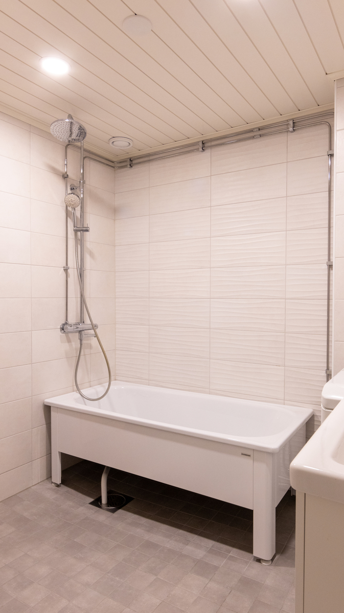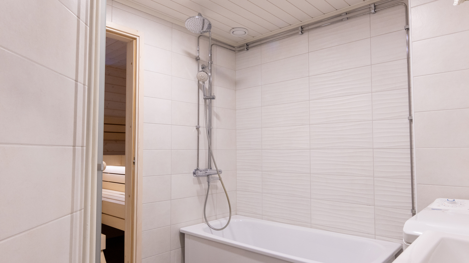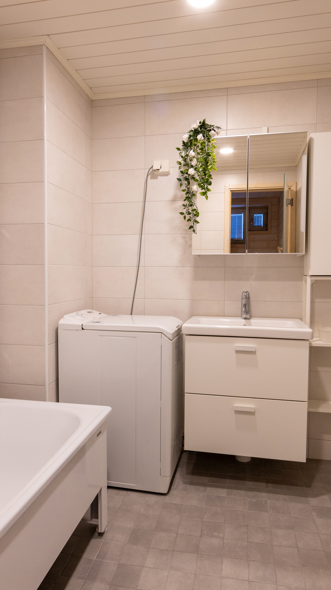 Pesukoneliitäntä, lattialämmitys, peilikaappi, suihku ja kiinteät valaisimet, seinät (kaakeli), lattiat (laatta) |