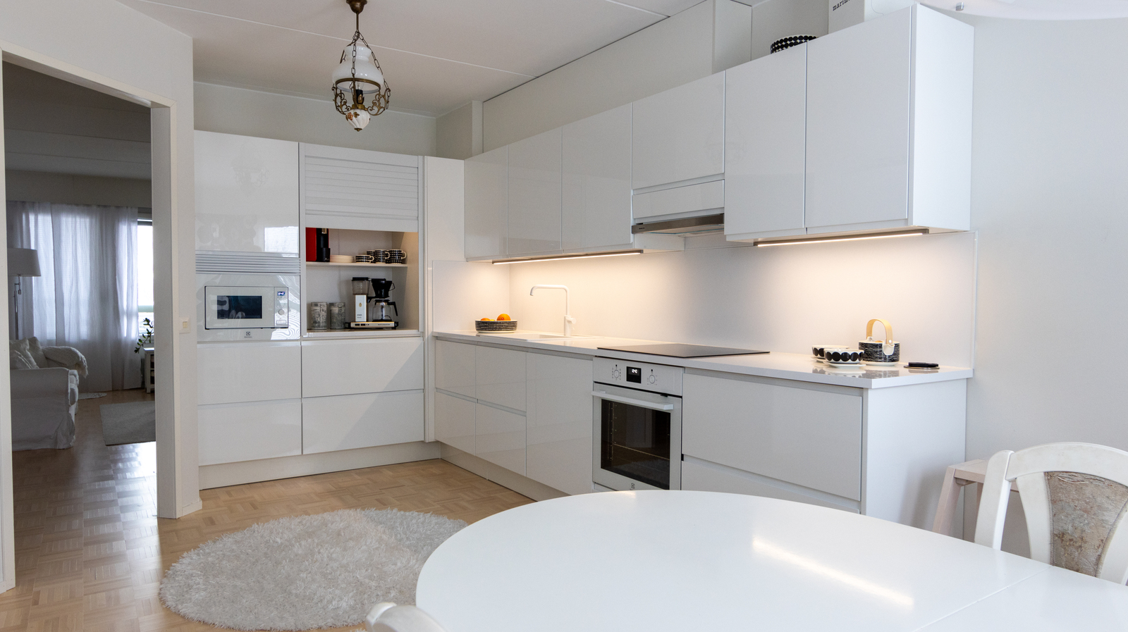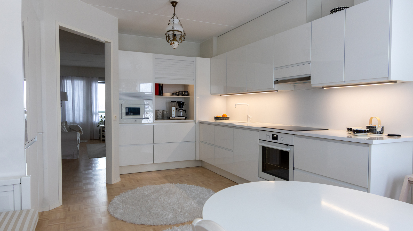 Liesi (Induktioliesi ja erillisuuni), työtasot (laminaatti), seinät (maali), lattiat (parketti), liesi, liesituuletin, jääkaappi, erillisuuni, erillinen pakastin ja kiinteät valaisimet |