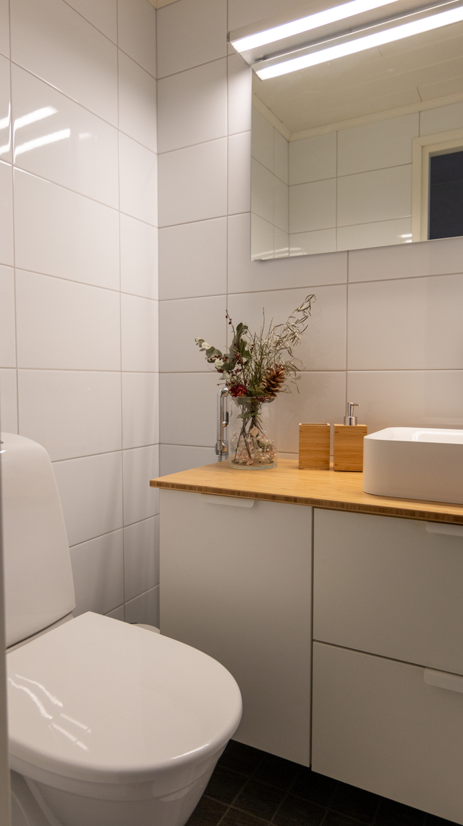 Lukumäärä: 1, Peilikaappi ja bidee-suihku, seinät (Maali), lattiat (Laatta) |