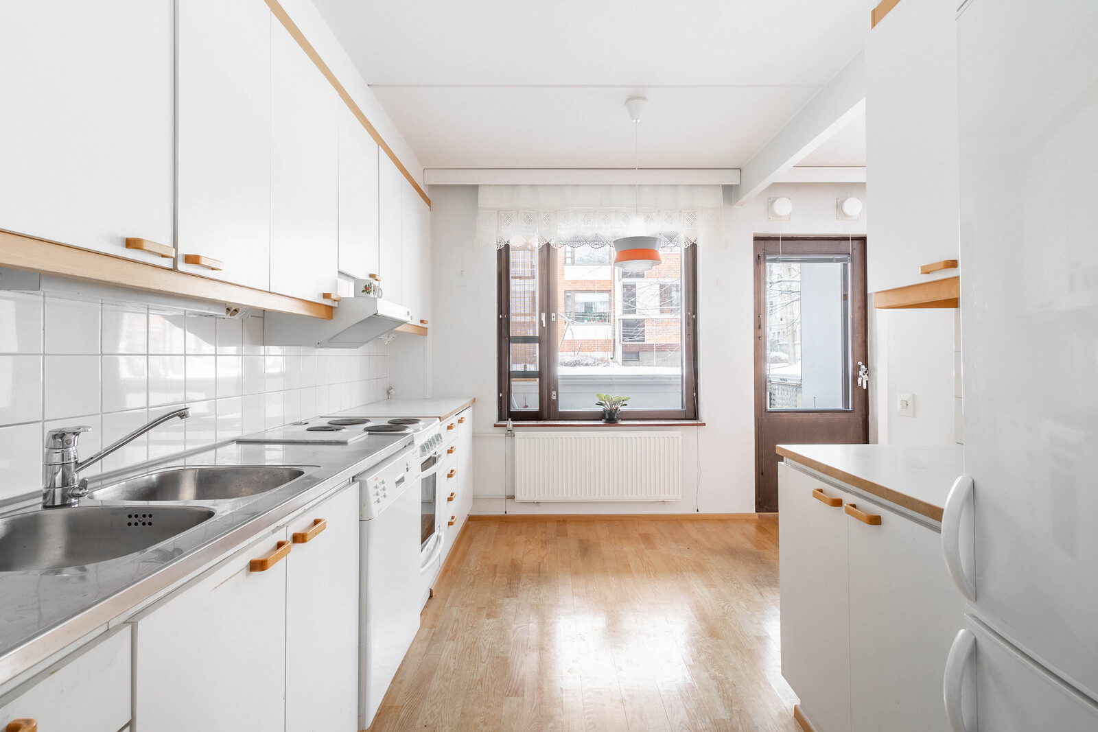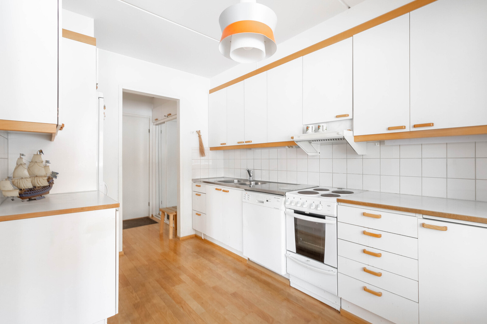 | Keittiön kuvaus | Liesi (sähköliesi), seinät (maali), lattiat (parketti), liesi, jääkaappipakastin, liesituuletin, astianpesukone ja kiinteät valaisimet |