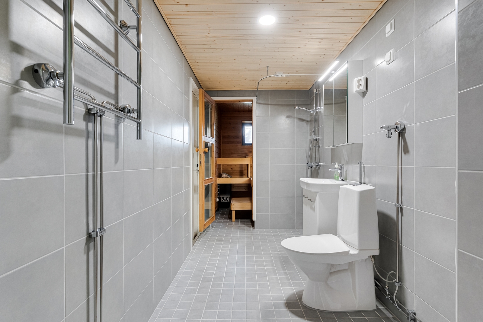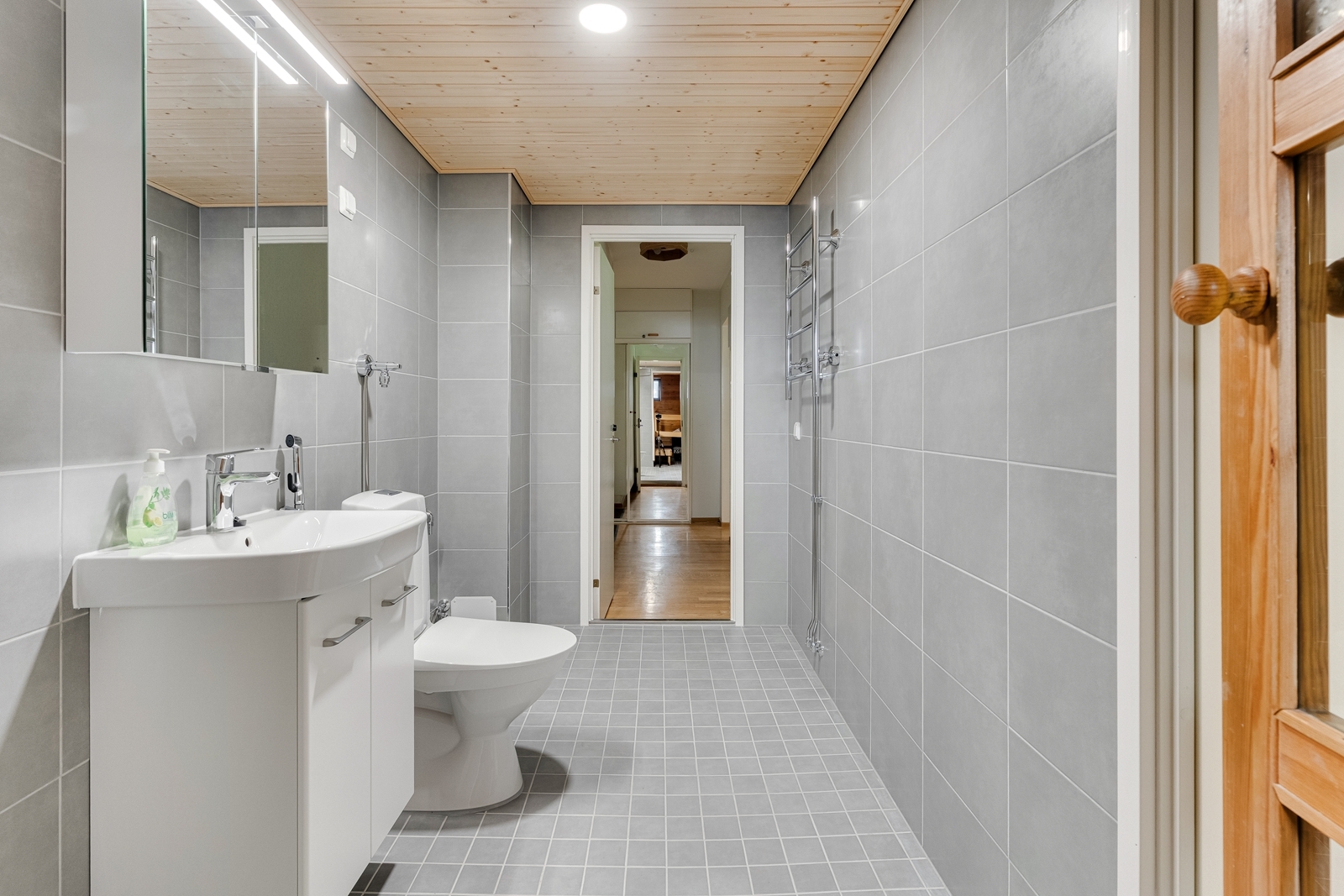 | Kylpyhuoneen kuvaus | Peilikaappi, suihkuseinä, allaskaappi, wc-istuin, pesukoneliitäntä ja kiinteät valaisimet, seinät (kaakeli), lattiat (laatta) |