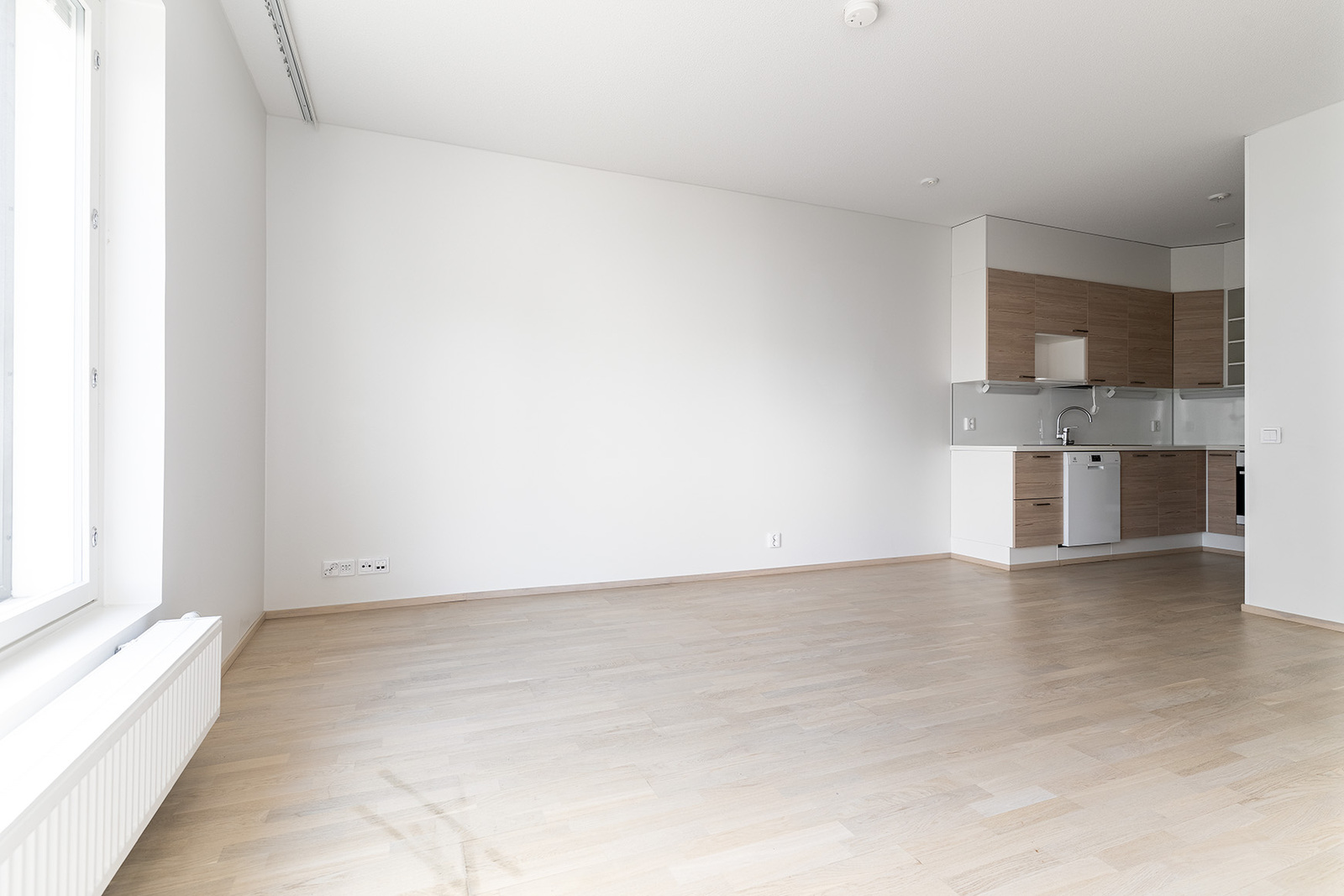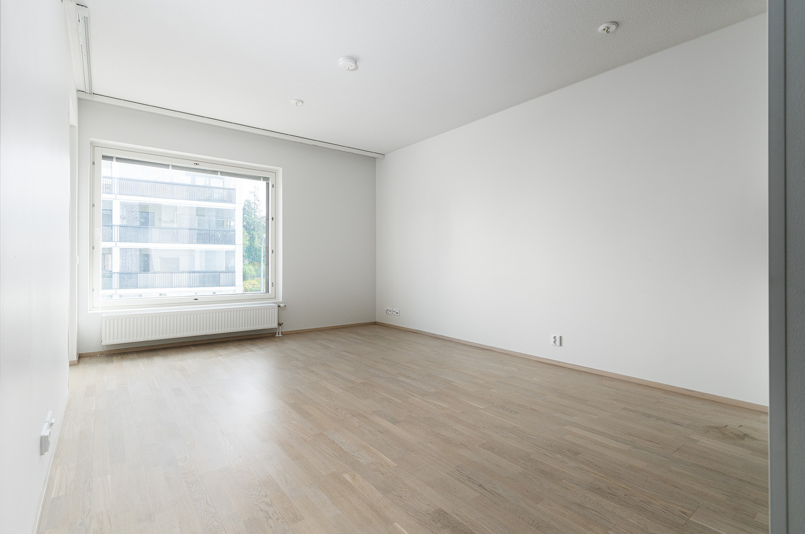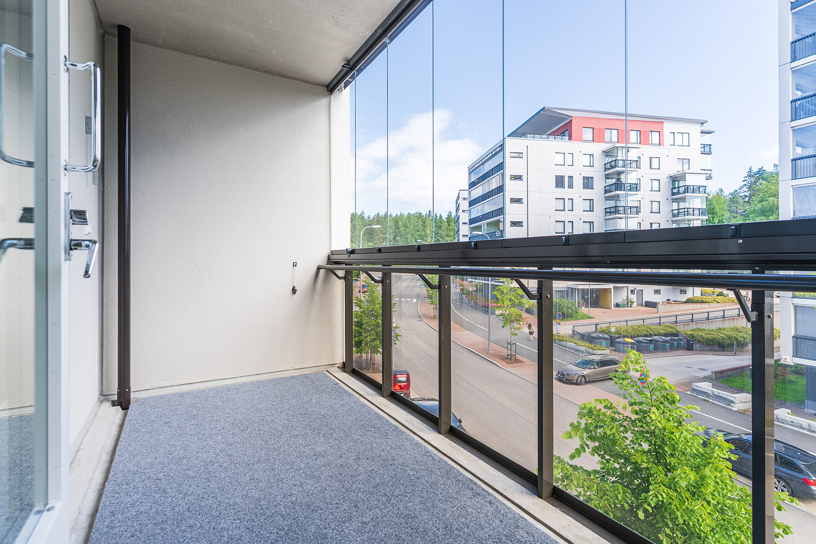 Asunnossa on tilava olohuone, josta pääsee lasitetulle parvekkeelle. Parveke suuntautuu koilliseen, tarjoten näkymät piha-alueille ja kadulle. Keittiö on varustettu laadukkailla kodinkoneilla, kuten astianpesukoneella ja keraamisella liedellä. Makuuhuoneessa on kauniit parkettilattiat, jotka jatkuvat myös olohuoneeseen ja keittiöön.