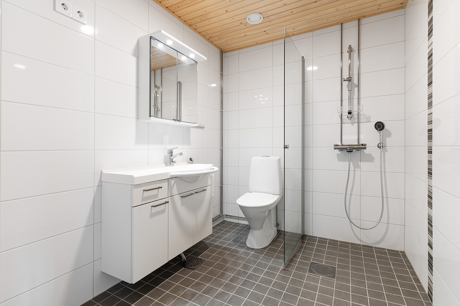 | Kylpyhuoneen kuvaus | Lattialämmitys, peilikaappi, suihku, suihkuseinä, wc-istuin, pesukoneliitäntä, bidee-suihku ja allaskaappi, seinät (kaakeli), lattiat (laatta) |