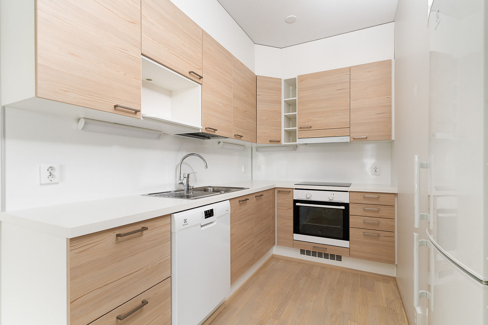 | Keittiön kuvaus | Liesi (Keraaminen liesi), seinät (maali), lattiat (parketti), astianpesukone, erillisuuni, jääkaappipakastin, liesituuletin ja liesi |