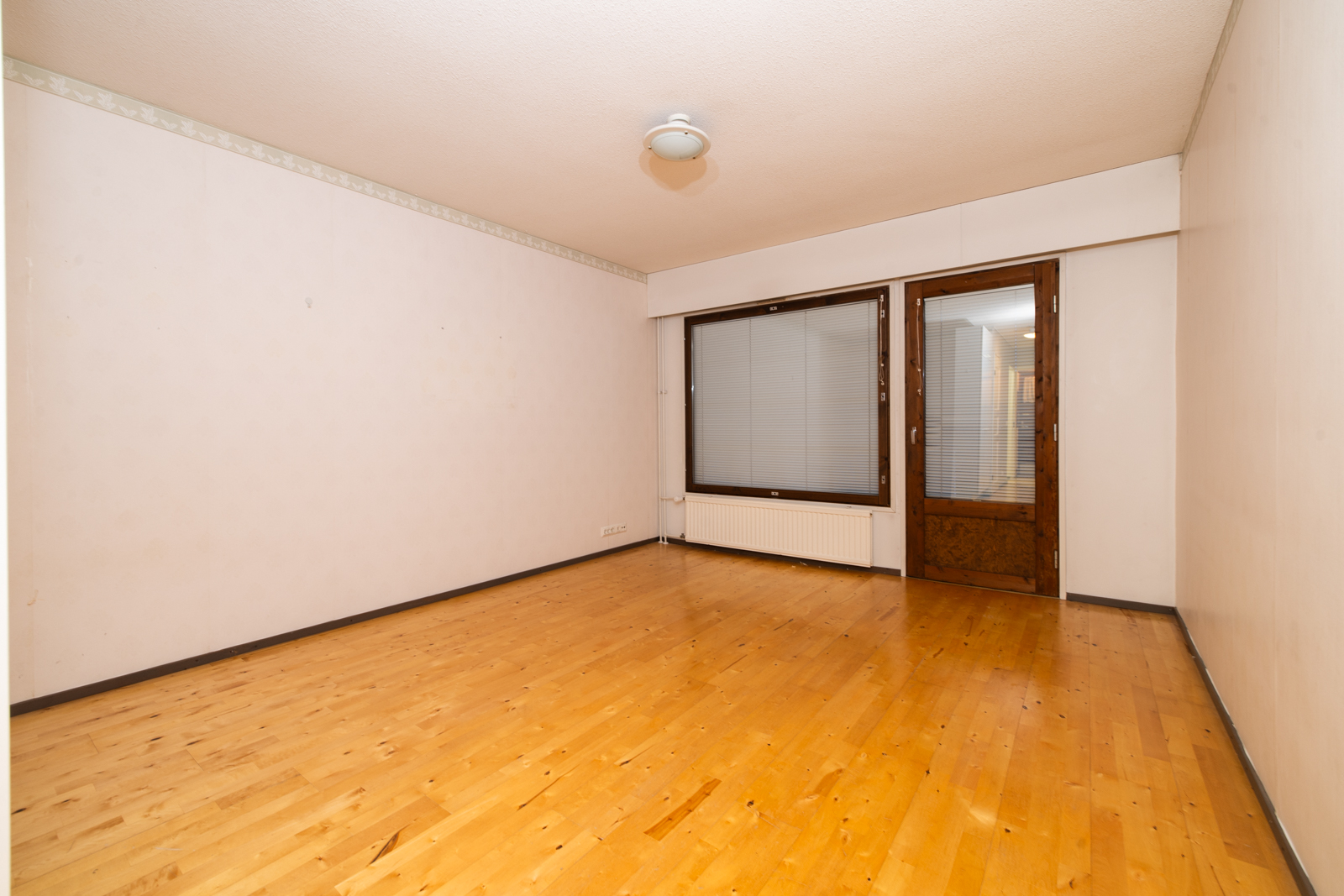 Olohuoneen kuvaus Seinät (tapetti), lattiat (parketti), Olohuoneen yhteydessä alkovi. Olohuoneesta käynti terassille.