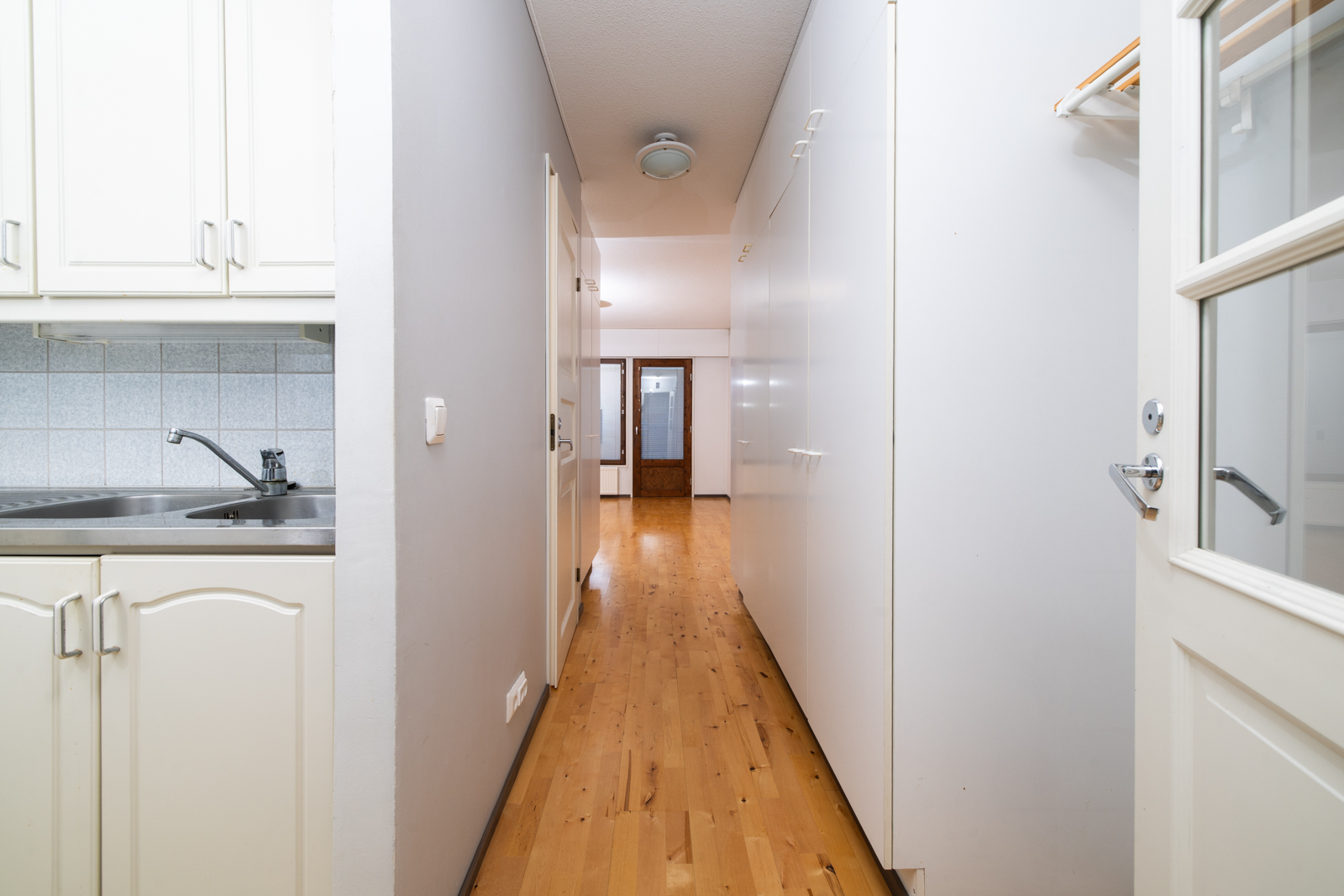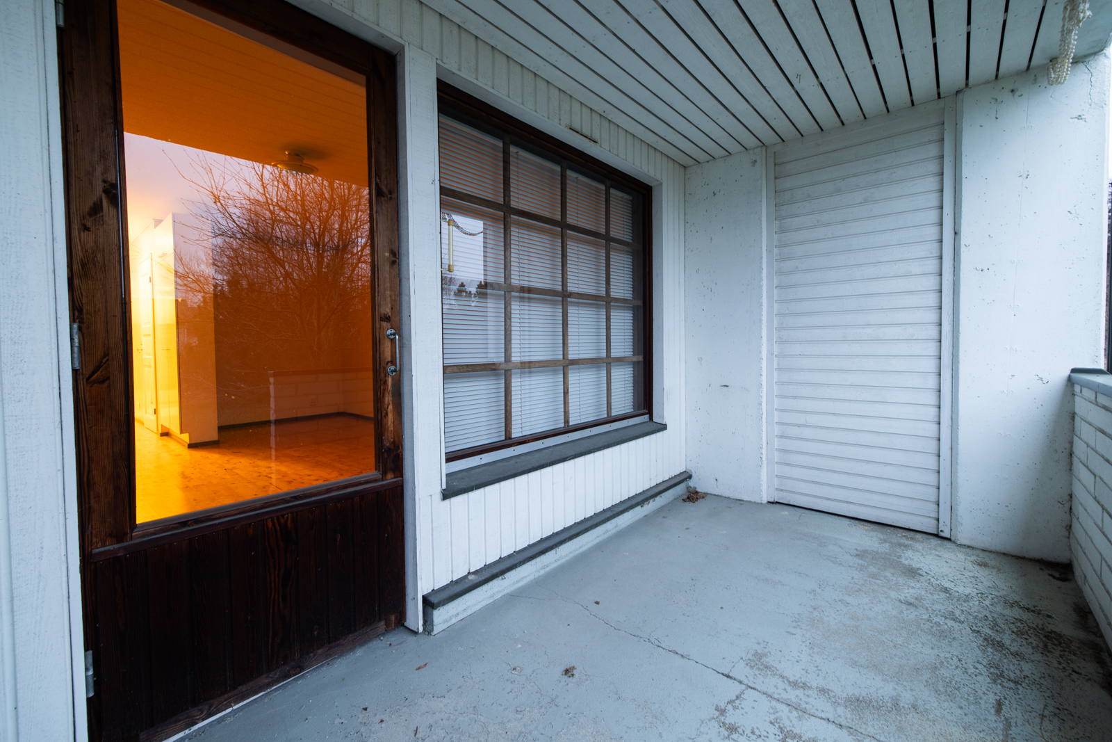 Tilojen kuvaus Eteisen lattiassa parketti, seinät maalattu, tuulikaapin lattiassa muovimatto, seinät maalattu.