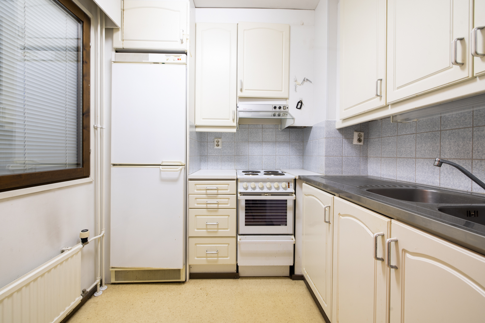 Keittiön kuvaus Liesi (Sähköhella), seinät (kaakeli ja maali), lattiat (muovimatto), jääkaappipakastin, liesituuletin ja uuni