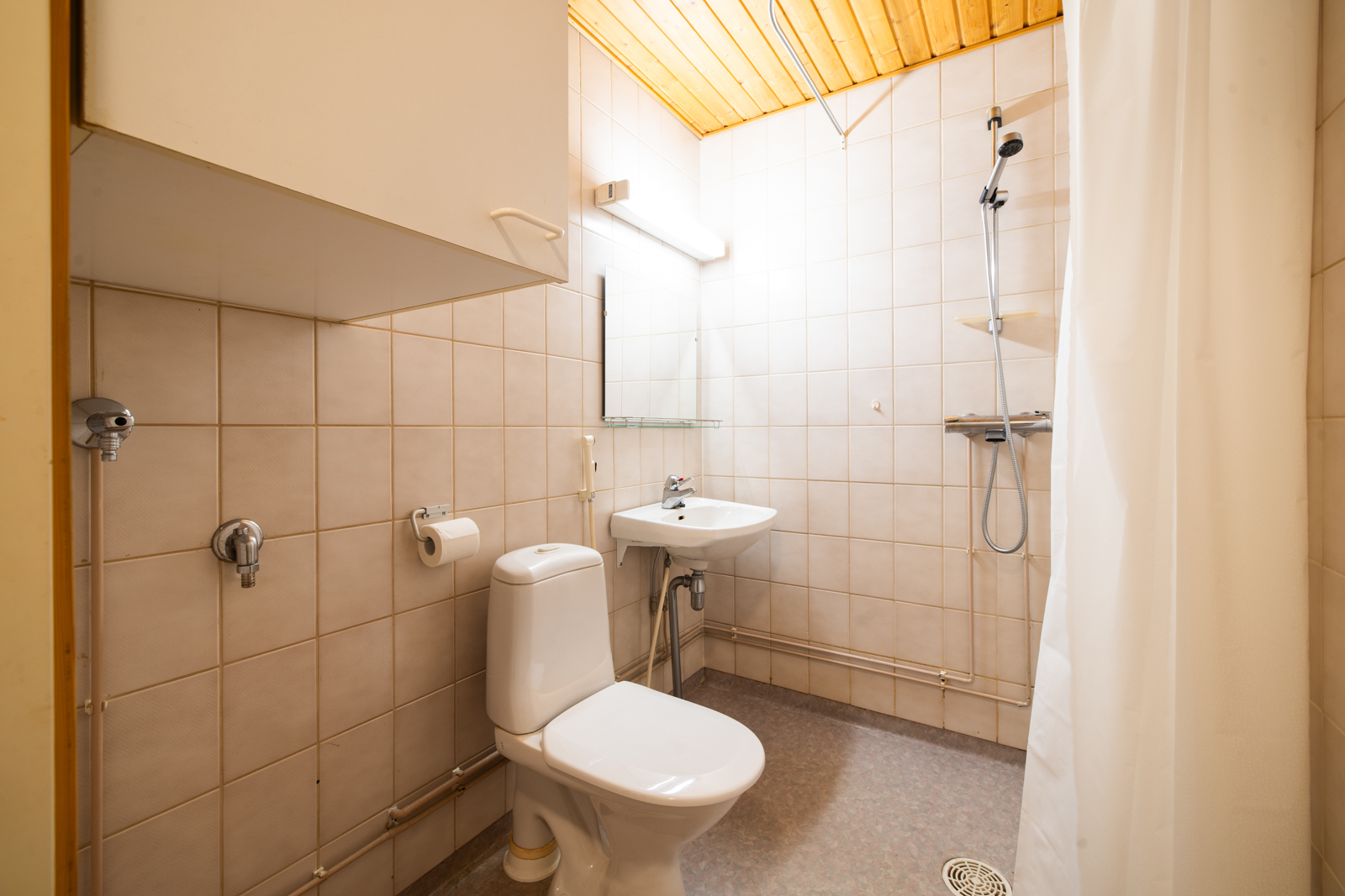 Kylpyhuoneen kuvaus WC-istuin, suihku, peili, pesuallas ja bidee-suihku, seinät (kaakeli), lattiat (muovimatto)