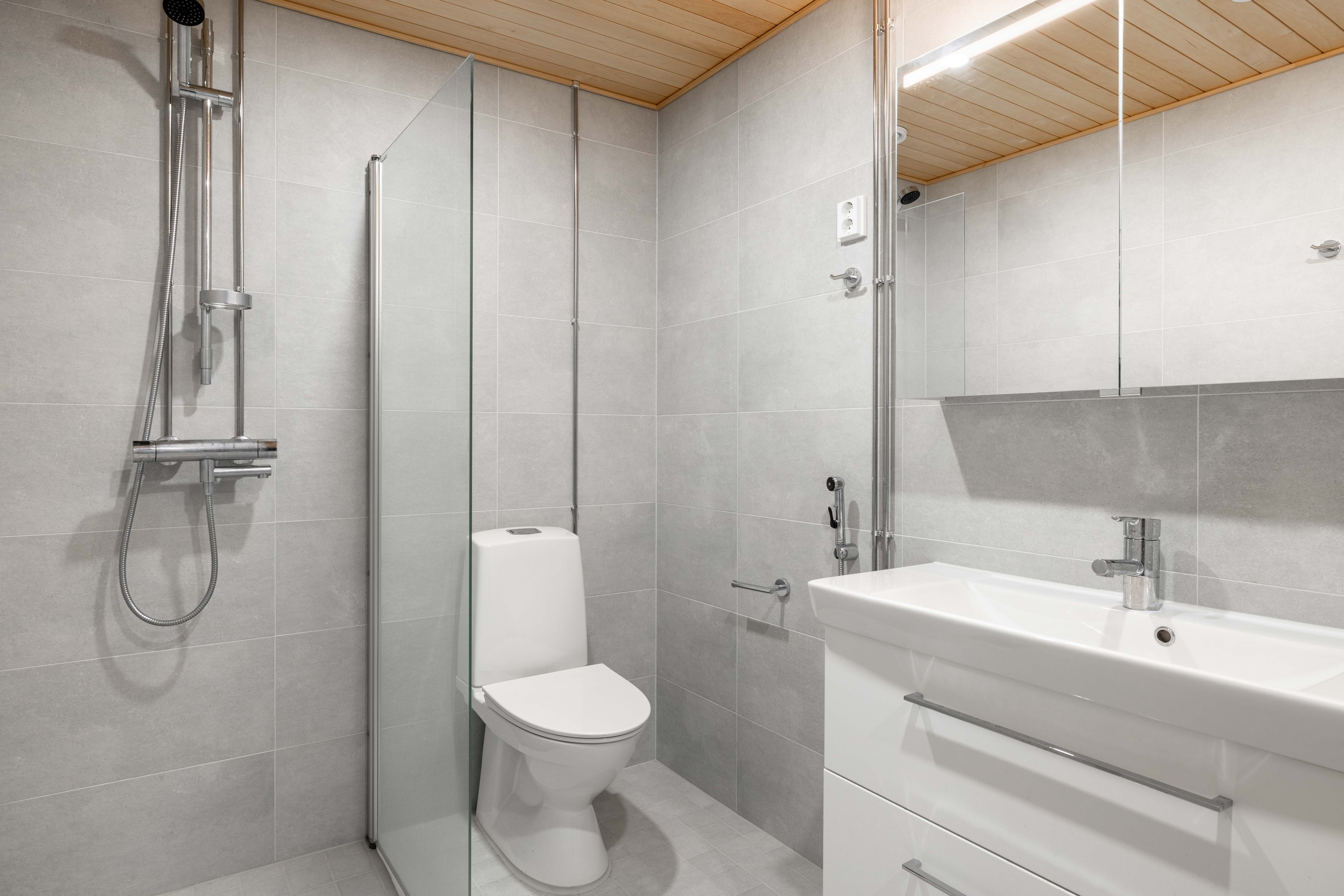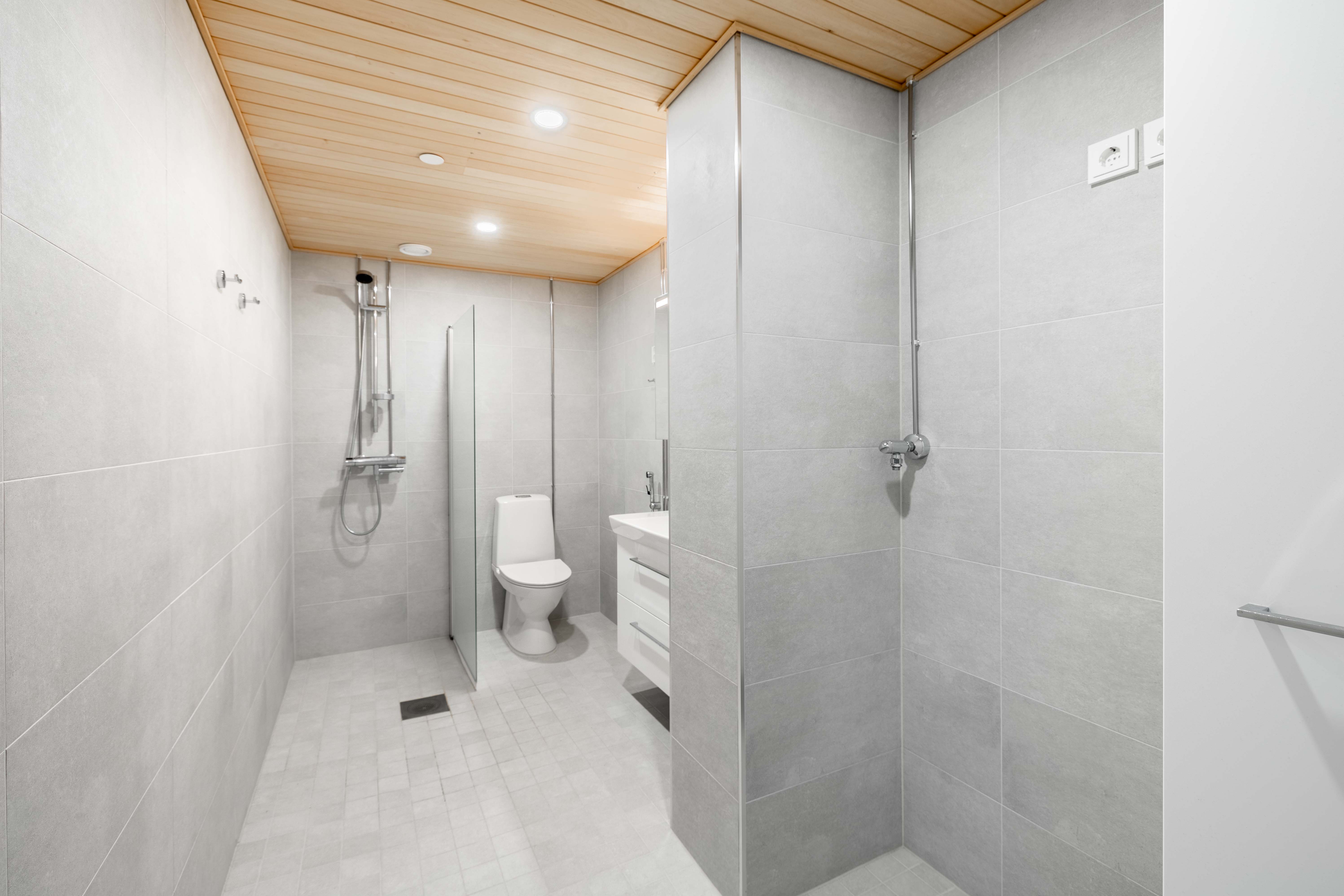 | Kylpyhuoneen kuvaus | WC-istuin, suihku, suihkuseinä, pesukoneliitäntä, pesuallas, peilikaappi, allaskaappi ja lattialämmitys, seinät (kaakeli), lattiat (laatta) |