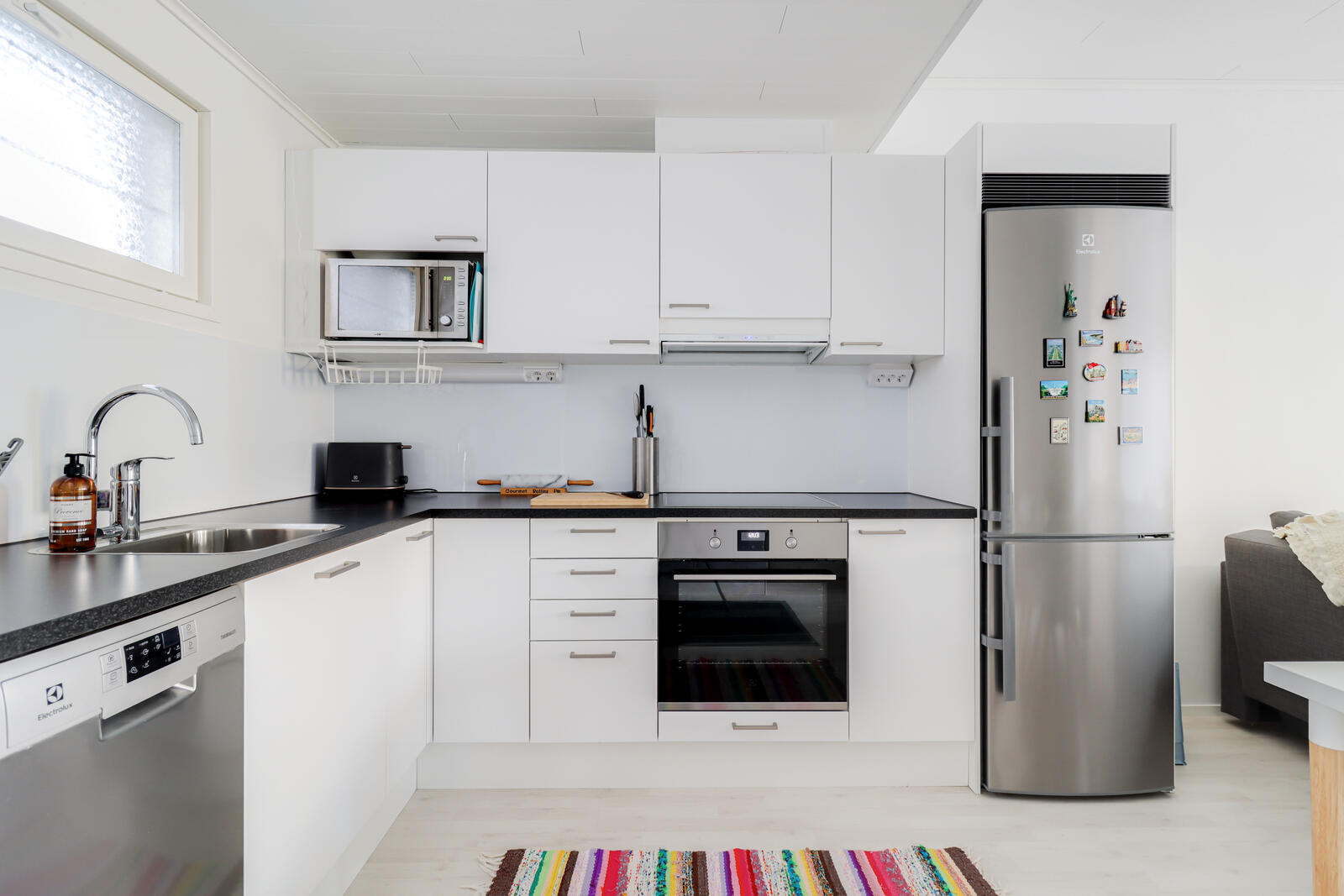Liesi (erillisuuni, liesitaso), työtasot (laminaatti), seinät (maali), lattiat (laminaatti), erillisuuni, jääkaappipakastin, liesituuletin, astianpesukone ja liesitaso, kiinteät valaisimet |