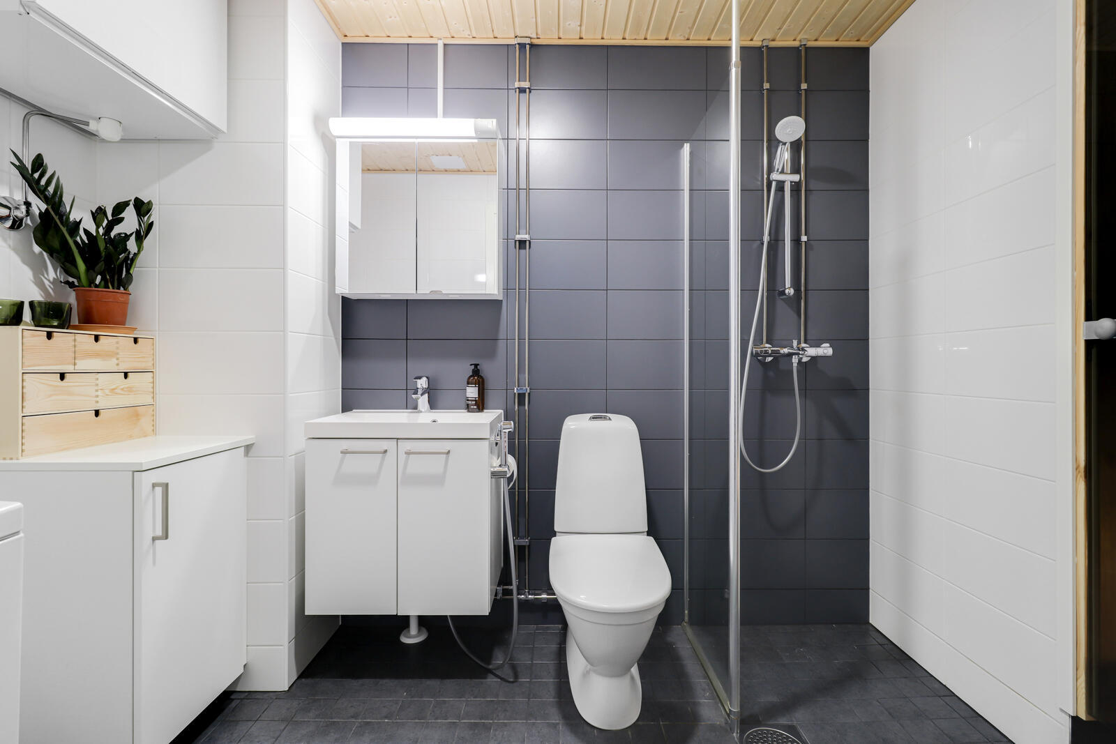 Suihku, allaskaappi, peili, lattialämmitys, suihkuseinä, wc-istuin, pesukoneliitäntä ja kiinteät valaisimet, seinät (kaakeli), lattiat (laatta) |
