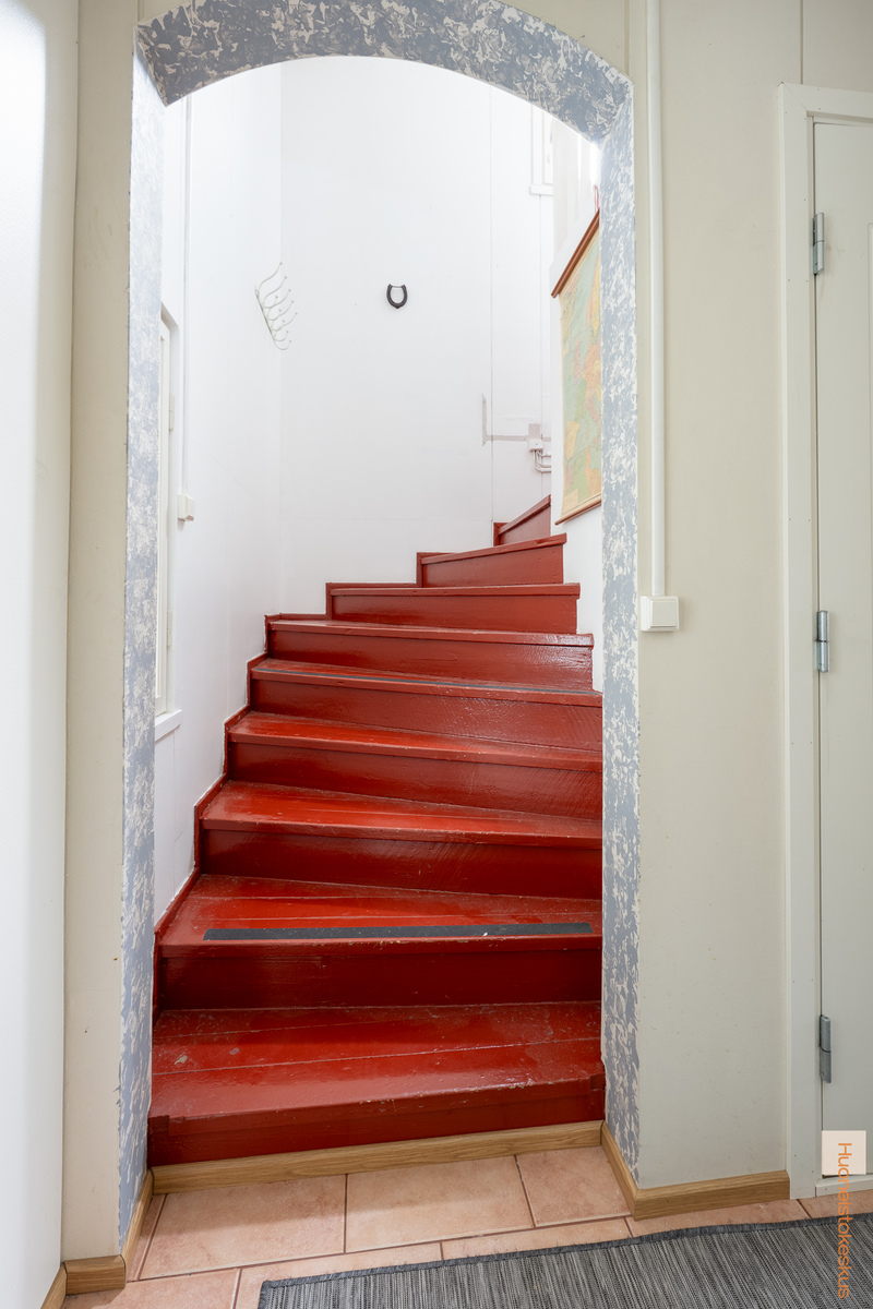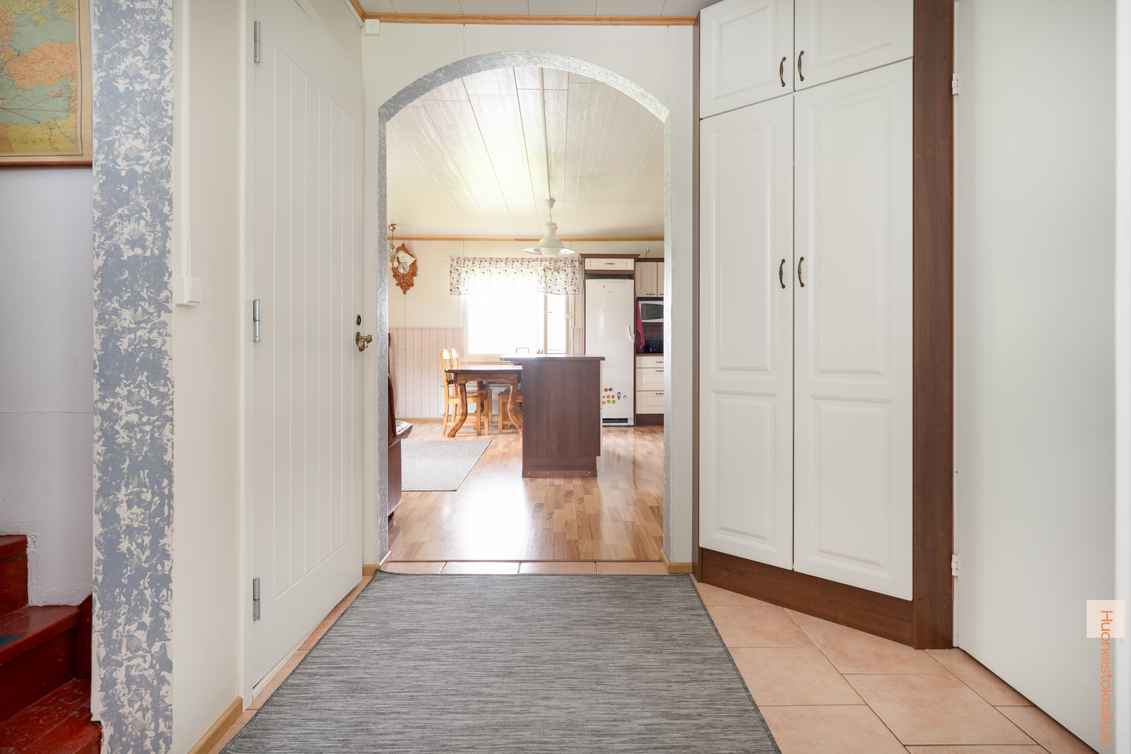 Sisääntulokerroksessa on lämmin kuisti, tupakeittiö, kaksi huonetta ja wc. Yläkerrassa on aula, kolme huonetta, katettu parveke ja ullakkotilaa. Kellarikerroksessa on takkahuone, pesuhuone, sauna ja kaksi varastohuonetta.