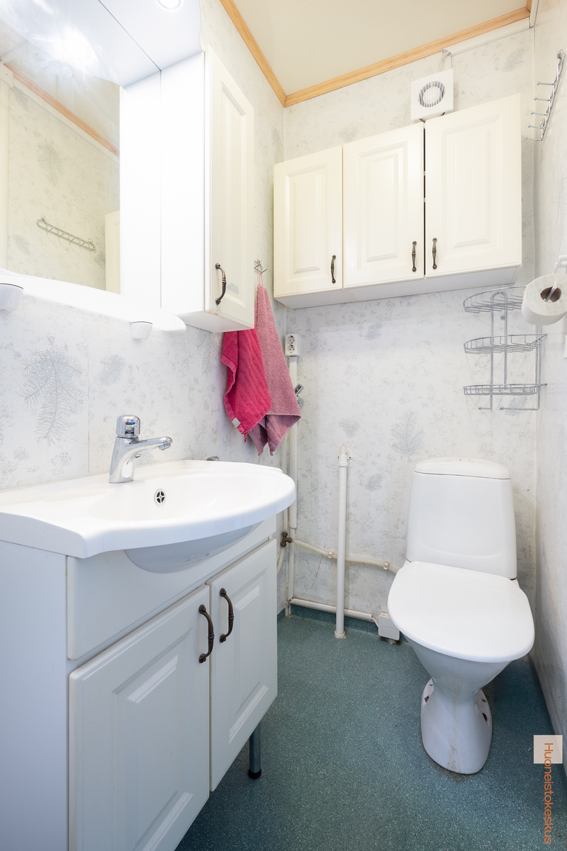 | WC-tilojen kuvaus | Lattiakaivo, bidee-suihku, pesukoneliitäntä, pesuallas, wc-istuin, peili ja allaskaappi, seinät (muovi), lattiat (Muovimatto) |