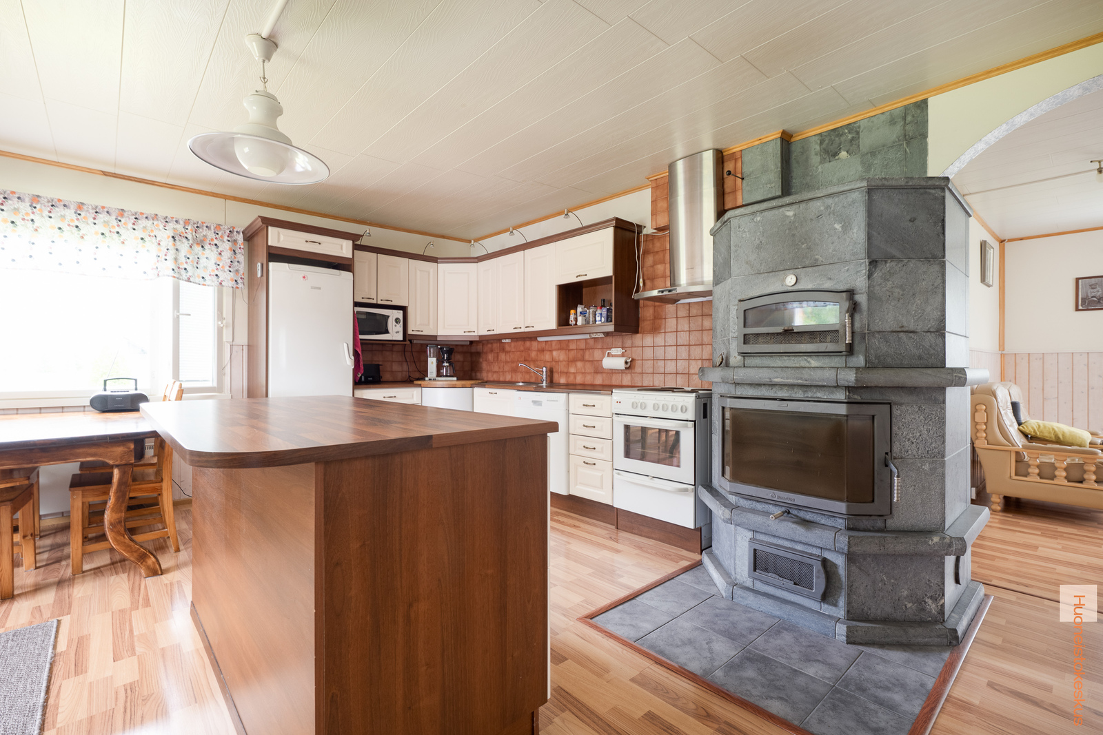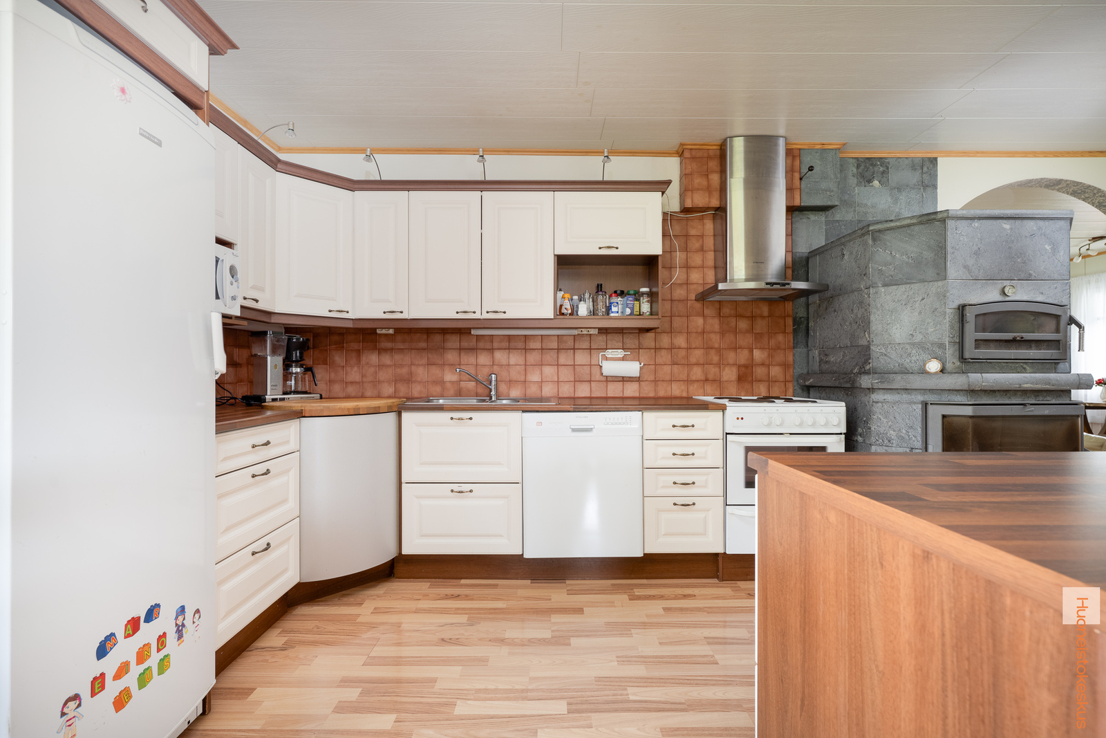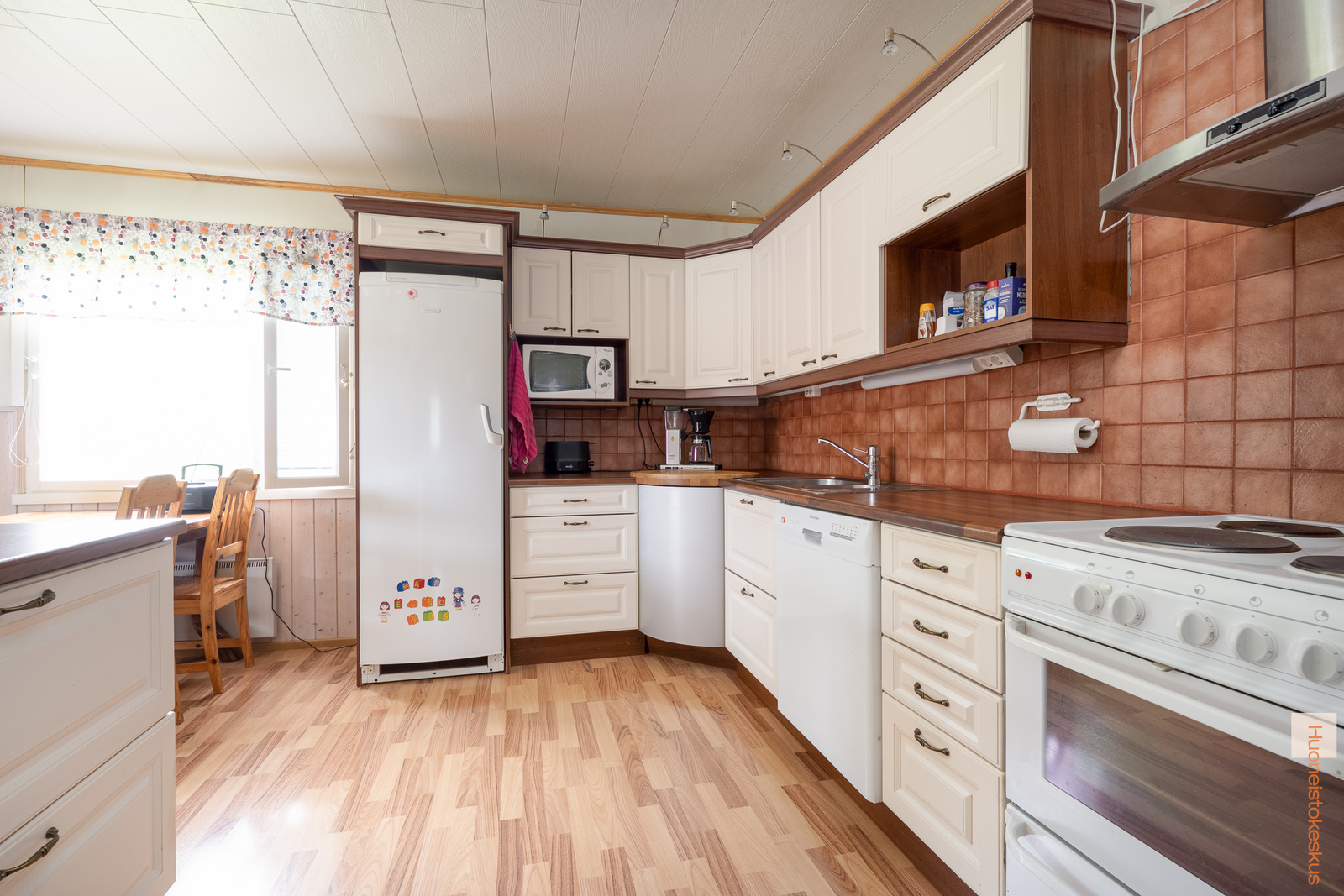 | Keittiön kuvaus | Liesi (Sähköhella), seinät (maali ja puolipaneeli), lattiat (laminaatti), liesituuletin, liesi, jääkaappi, astianpesukone ja kiinteät valaisimet |