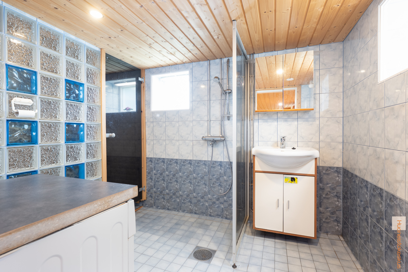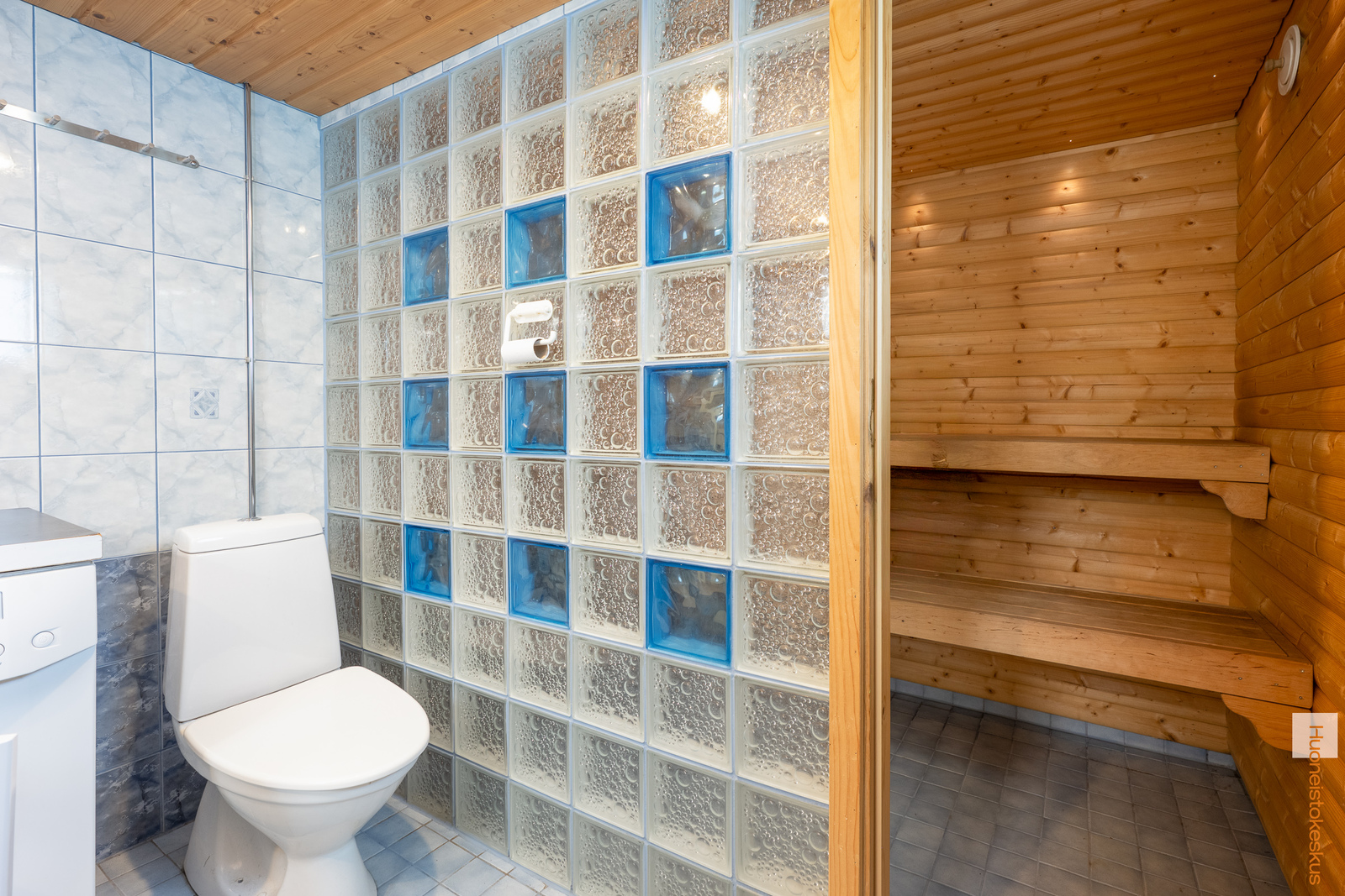 | Kylpyhuoneen kuvaus | Suihku, wc-istuin, lattialämmitys, peilikaappi, pesukoneliitäntä, suihkuseinä, allaskaappi, pesuallas ja kiinteät valaisimet, seinät (kaakeli), lattiat (laatta) |