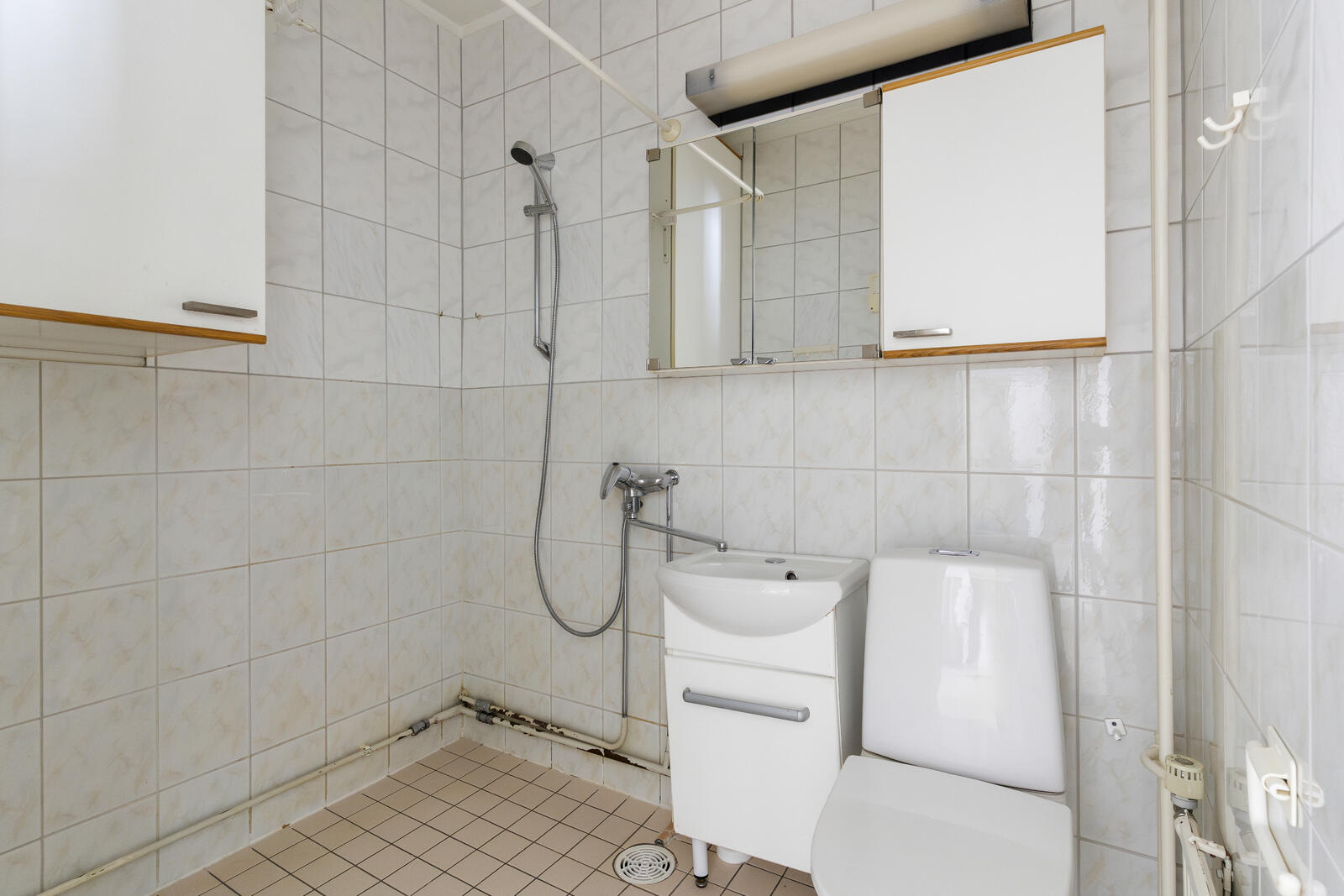| Kylpyhuoneen kuvaus | WC-istuin, peilikaappi, suihku ja pesukoneliitäntä, seinät (kaakeli), lattiat (laatta) |
