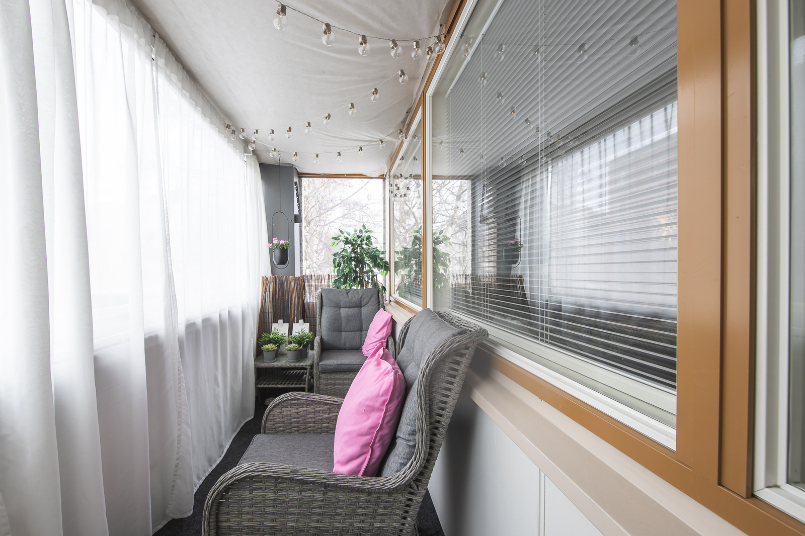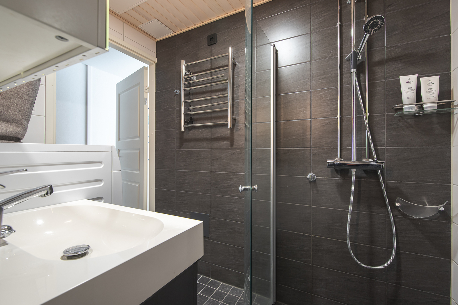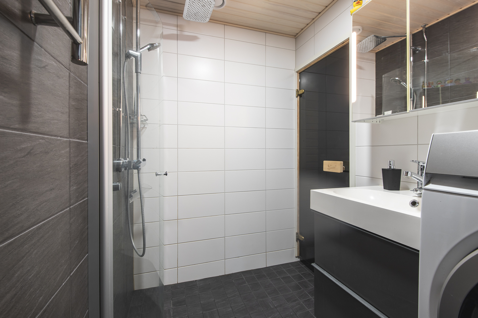 Saunassa nautit sen antamista lempeistä löylyistä, kylpyhuoneen suihkussa virkistäydyt saunomisen yhteydessä, lisäksi erillinen wc ja tilava lasitettu terassi joka antaa huoneistolle mukavasti lisää oleskelutilaa.