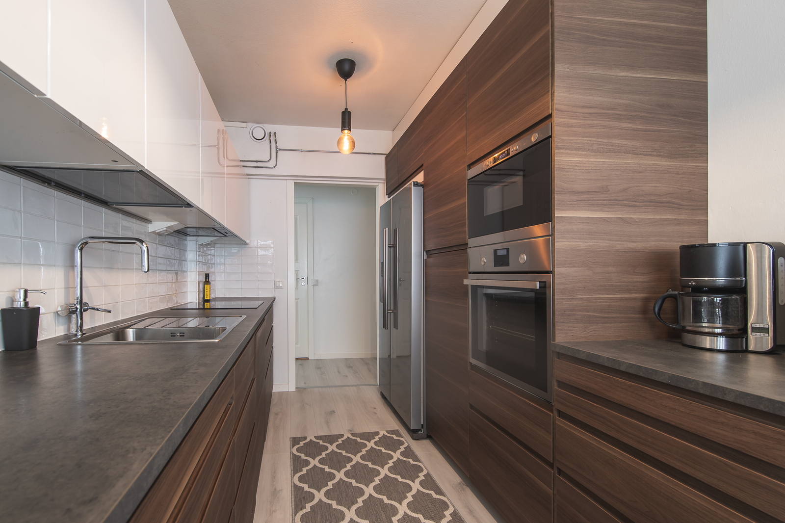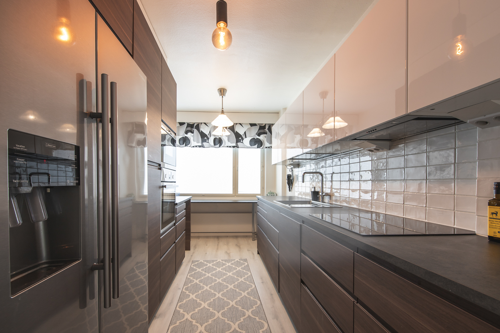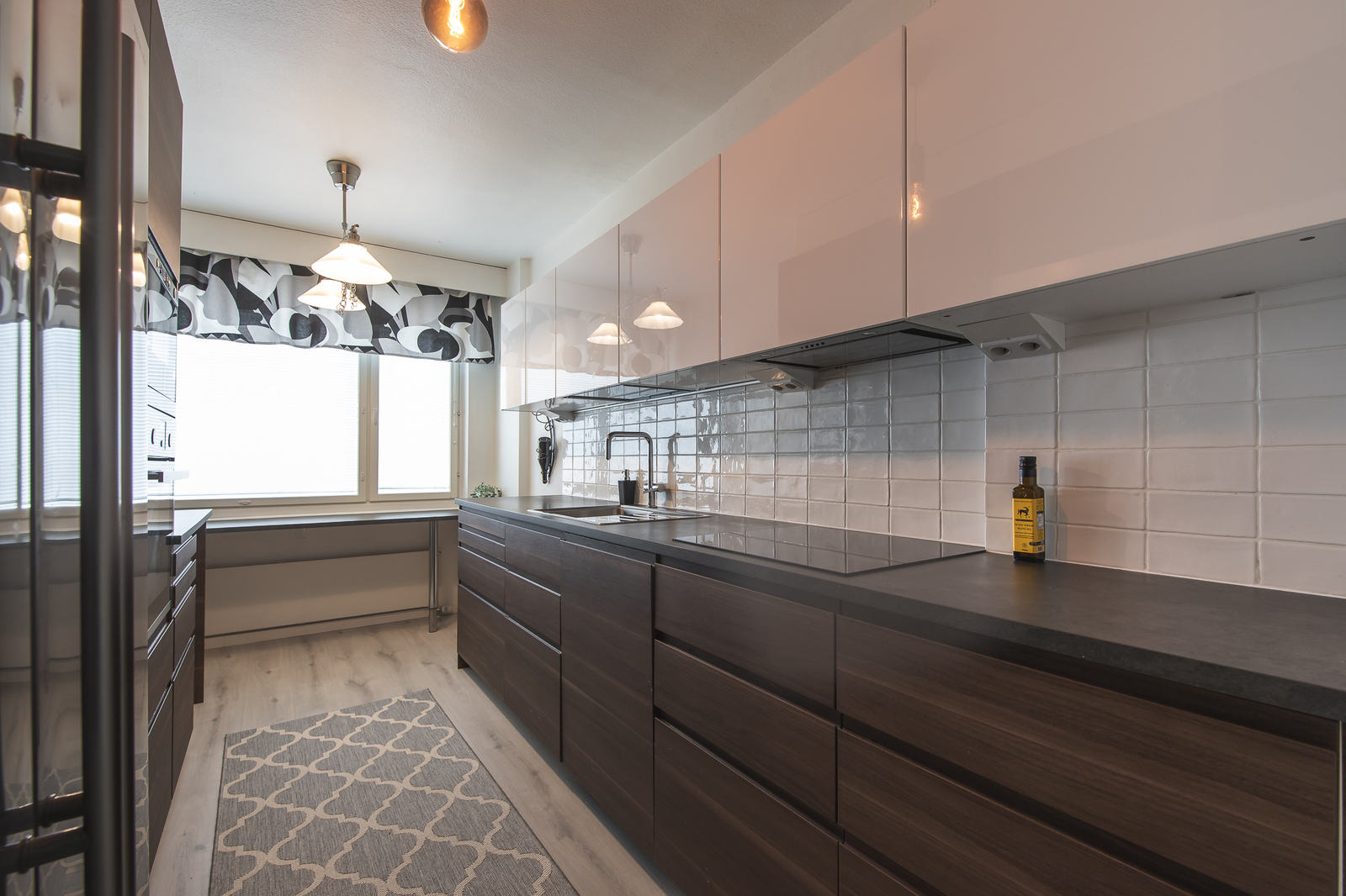 Liesi (Induktioliesi), työtasot (laminaatti), seinät (maali), lattiat (laminaatti), jääkaappipakastin, astianpesukone, liesi, mikroaaltouuni, liesituuletin ja kiinteät valaisimet |