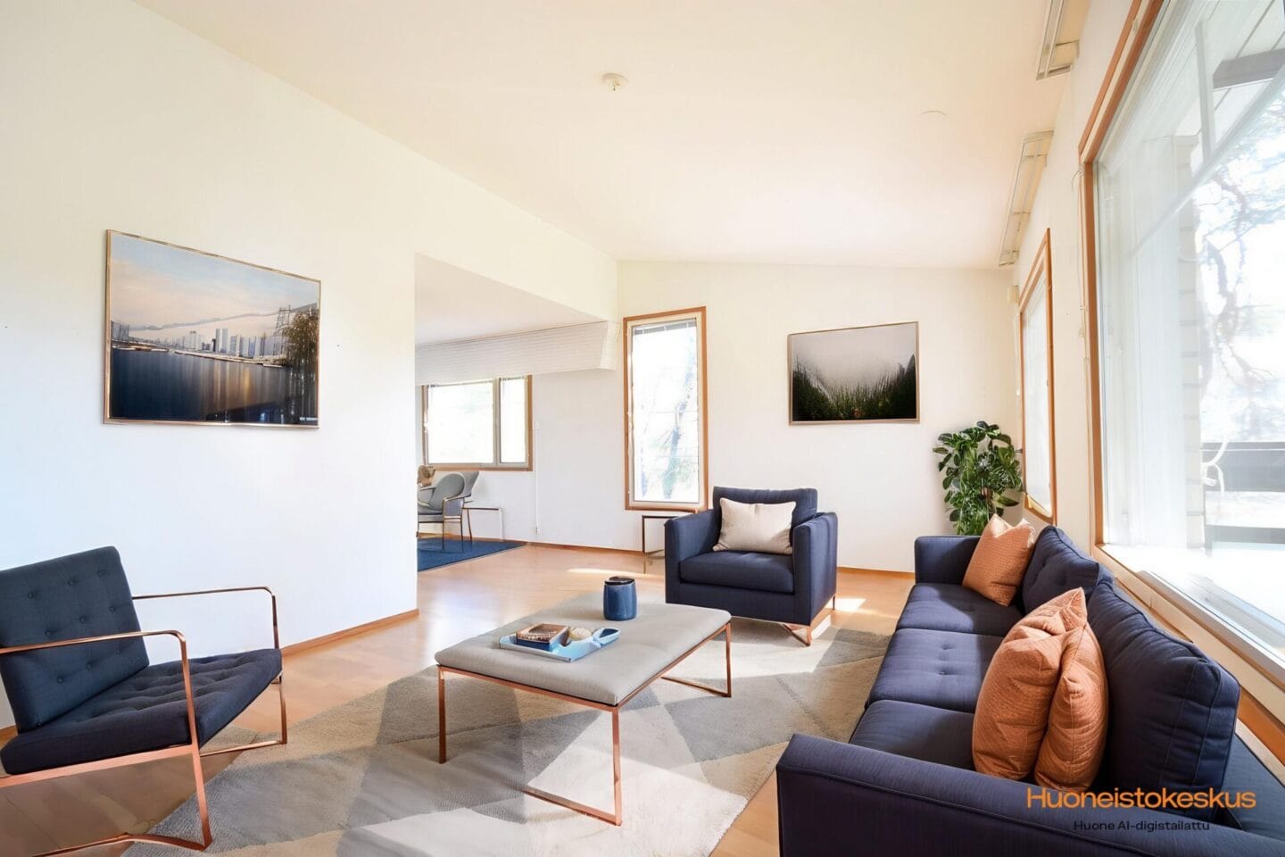 Olohuoneen kuvaus Seinät (maali ja lasikuitutapetti), lattiat (parketti), iso olohuone, runsaasti ikkunoita, kolmeen ilmansuuntaan, upein mäntynäkymin. Olohuoneen yhteydessä hyvä ns. ruokailutila, joka vitriinikaapistolla aukeaa keittiöön.