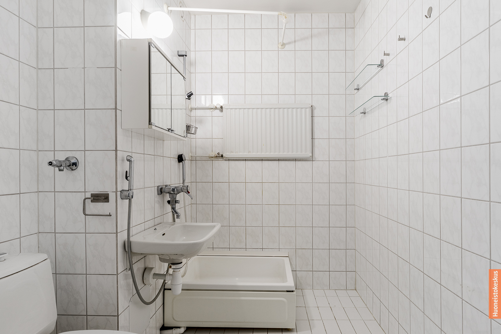 | Kylpyhuoneen kuvaus | Peilikaappi, suihku, wc-istuin, pesukoneliitäntä ja kiinteät valaisimet, seinät (kaakeli), lattiat (laatta) |