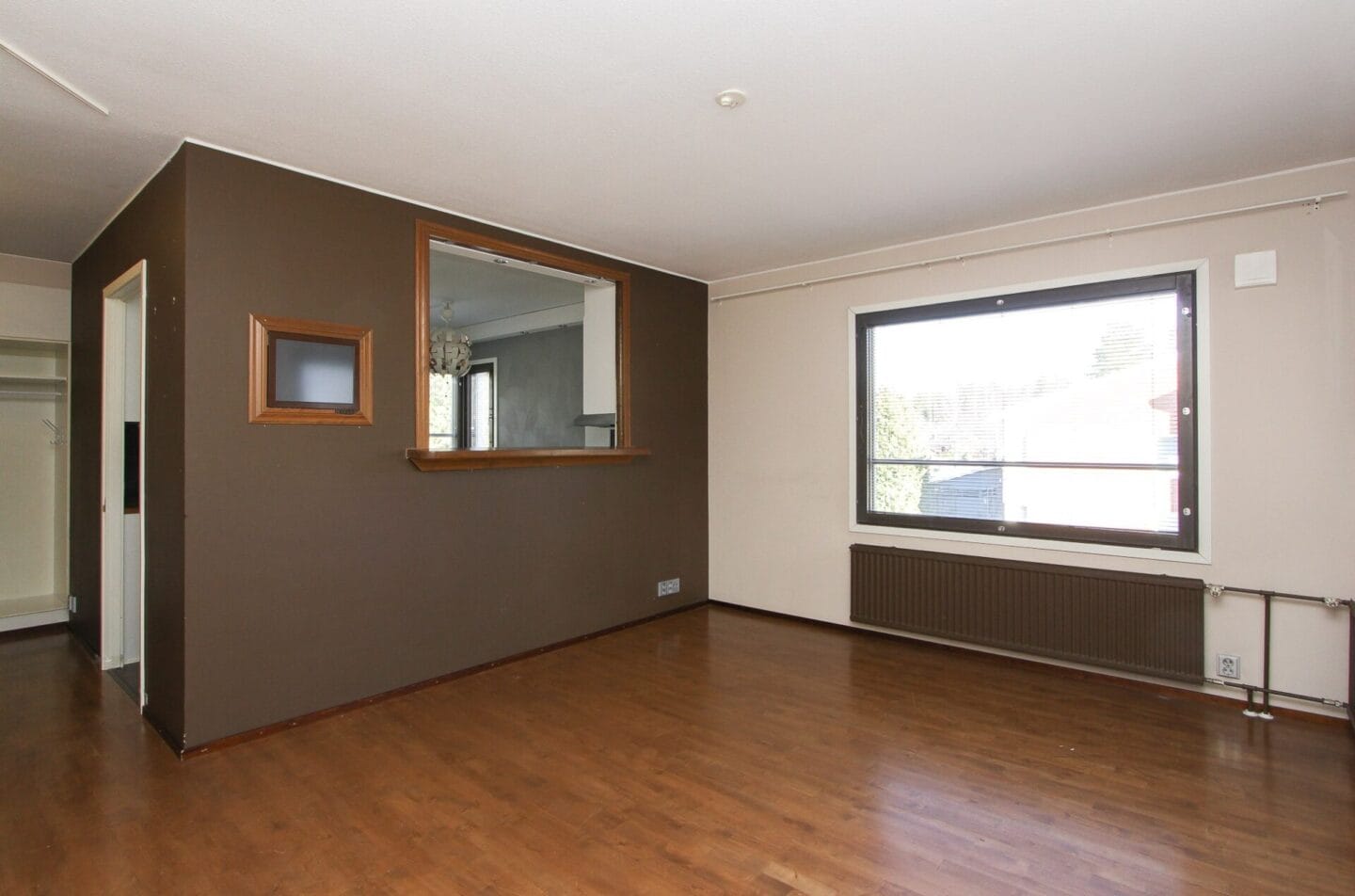 Seinät (maali), lattiat (laminaatti), Tilava olohuone, josta kulkuyhteys kodin viihtyisälle omalle parvekkeelle. Olohuoneen ja keittiön välisessä seinässä persoonallinen lisää valoa ja avaruutta antava aukko. |