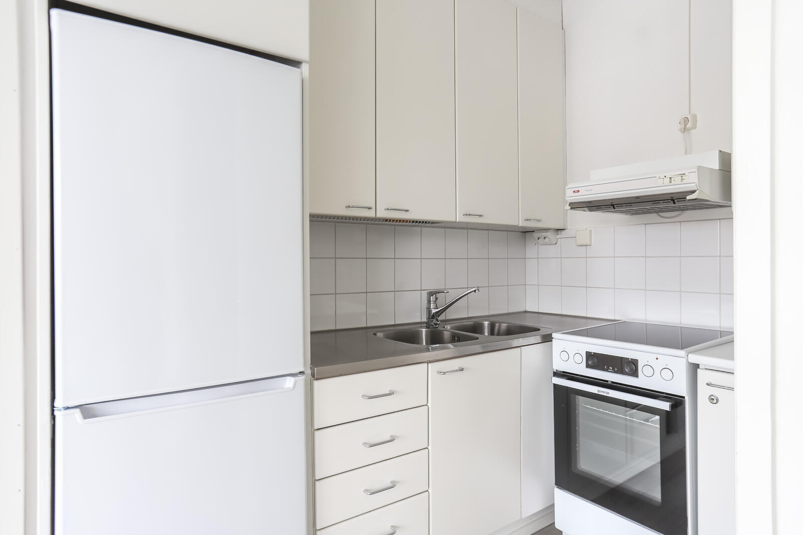 Liesi (Keraaminen liesi), työtasot (laminaatti ja metalli), seinät (maali), lattiat (vinyyli), liesituuletin ja jääkaappipakastin |