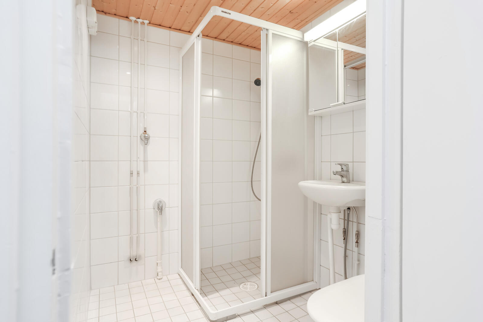 Suihku, wc-istuin, lattialämmitys, suihkukaappi, peilikaappi, pesukoneliitäntä ja kiinteät valaisimet, seinät (kaakeli), lattiat (laatta) |