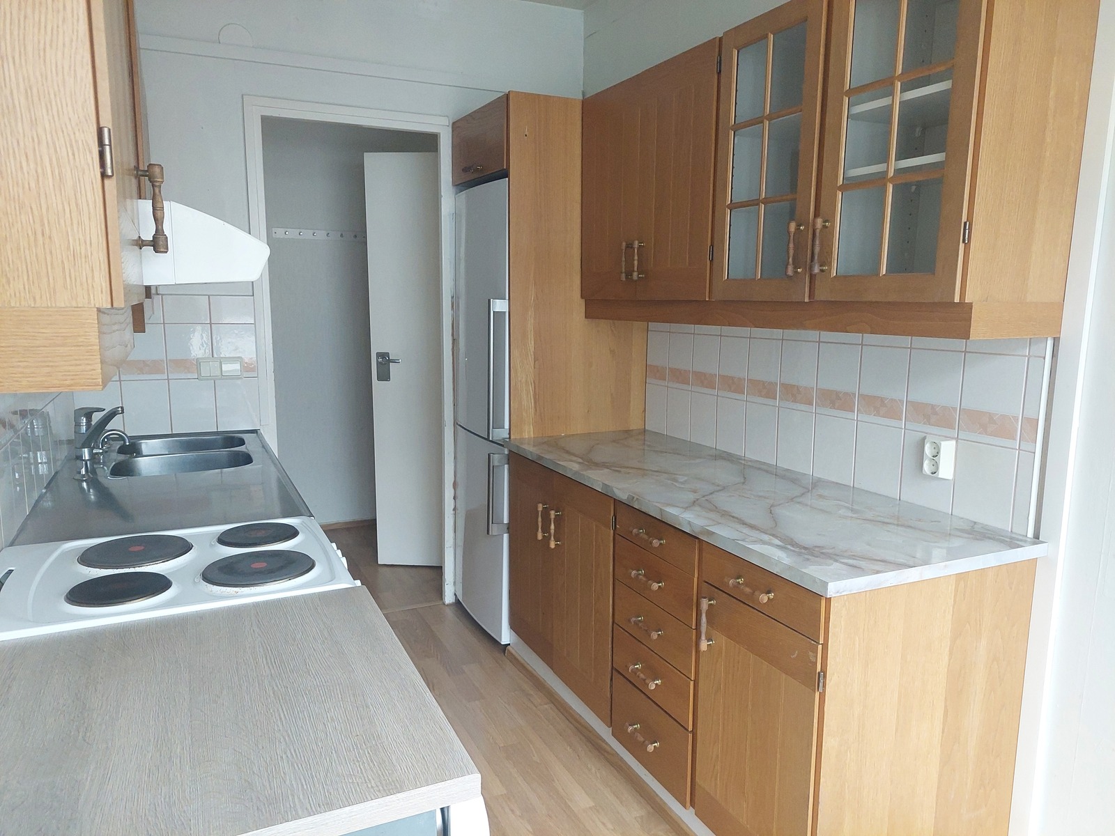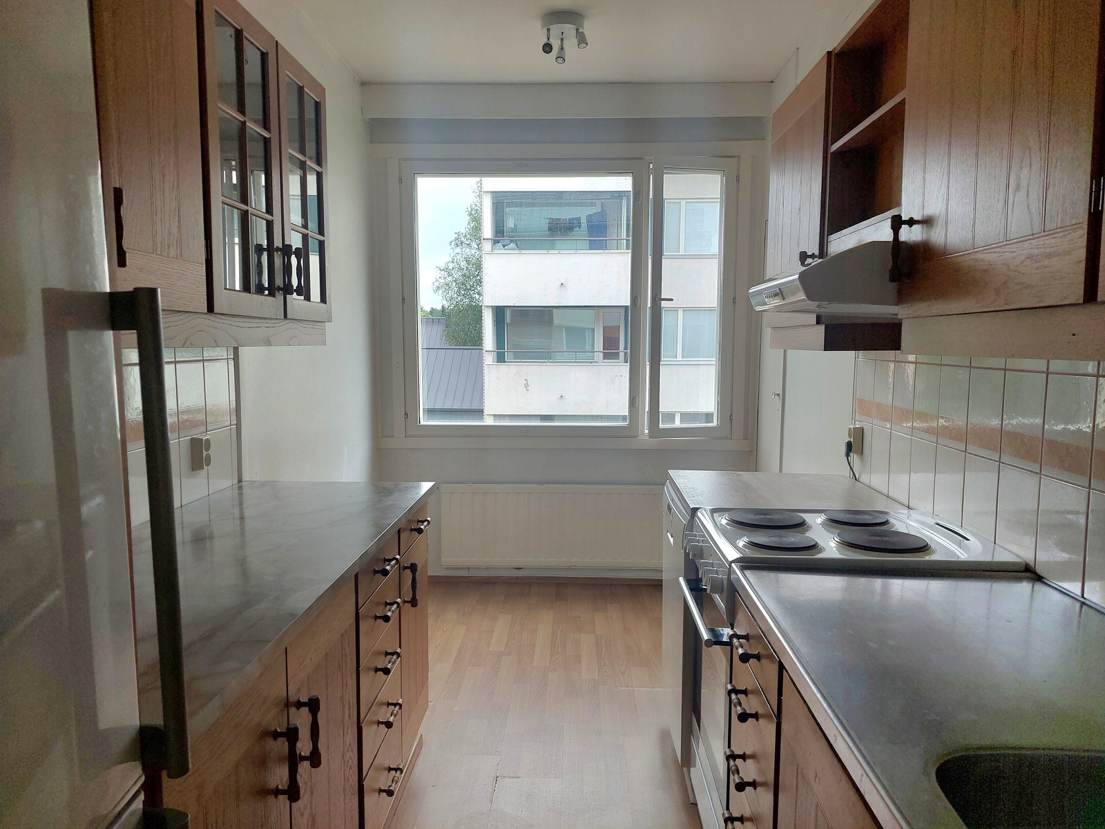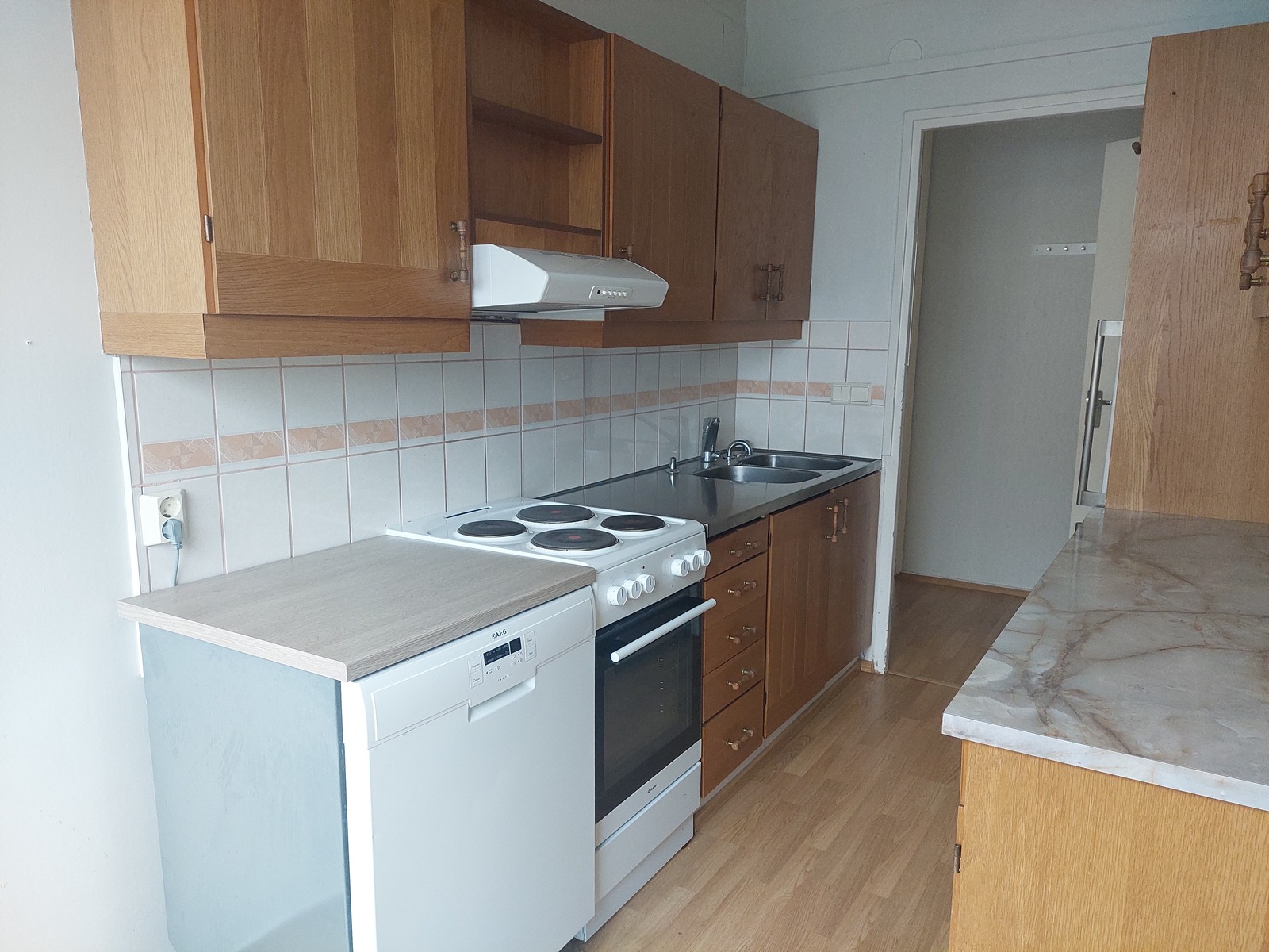 | Keittiön kuvaus | Liesi (sähköliesi), työtasot (laminaatti), seinät (maali), lattiat (muovimatto), jääkaappipakastin, astianpesukone, liesi ja liesituuletin |