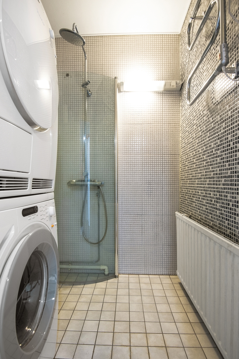 Suihkuseinä, pesukoneliitäntä ja suihku, seinät (kaakeli), lattiat (laatta) |