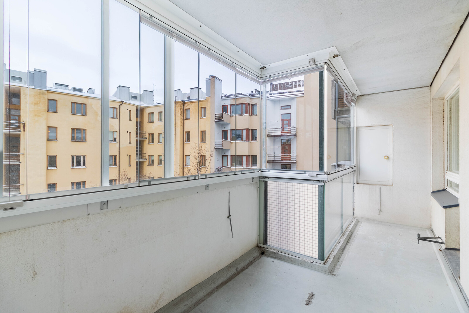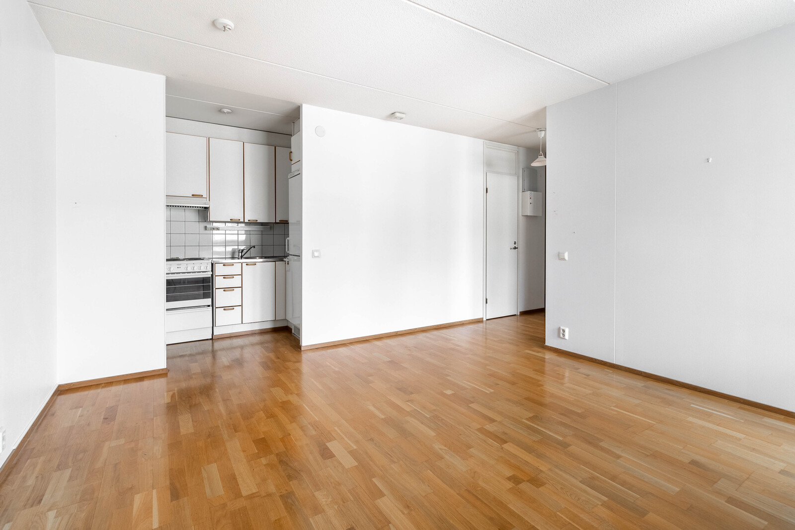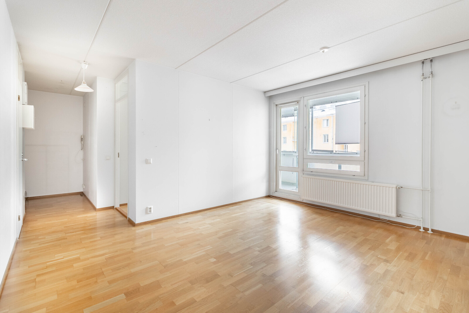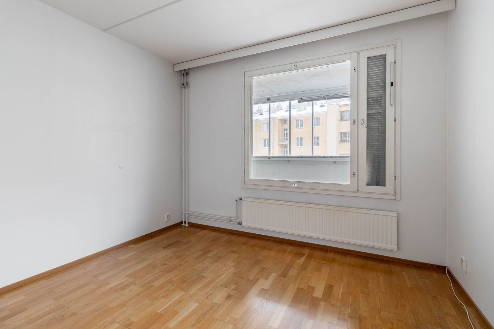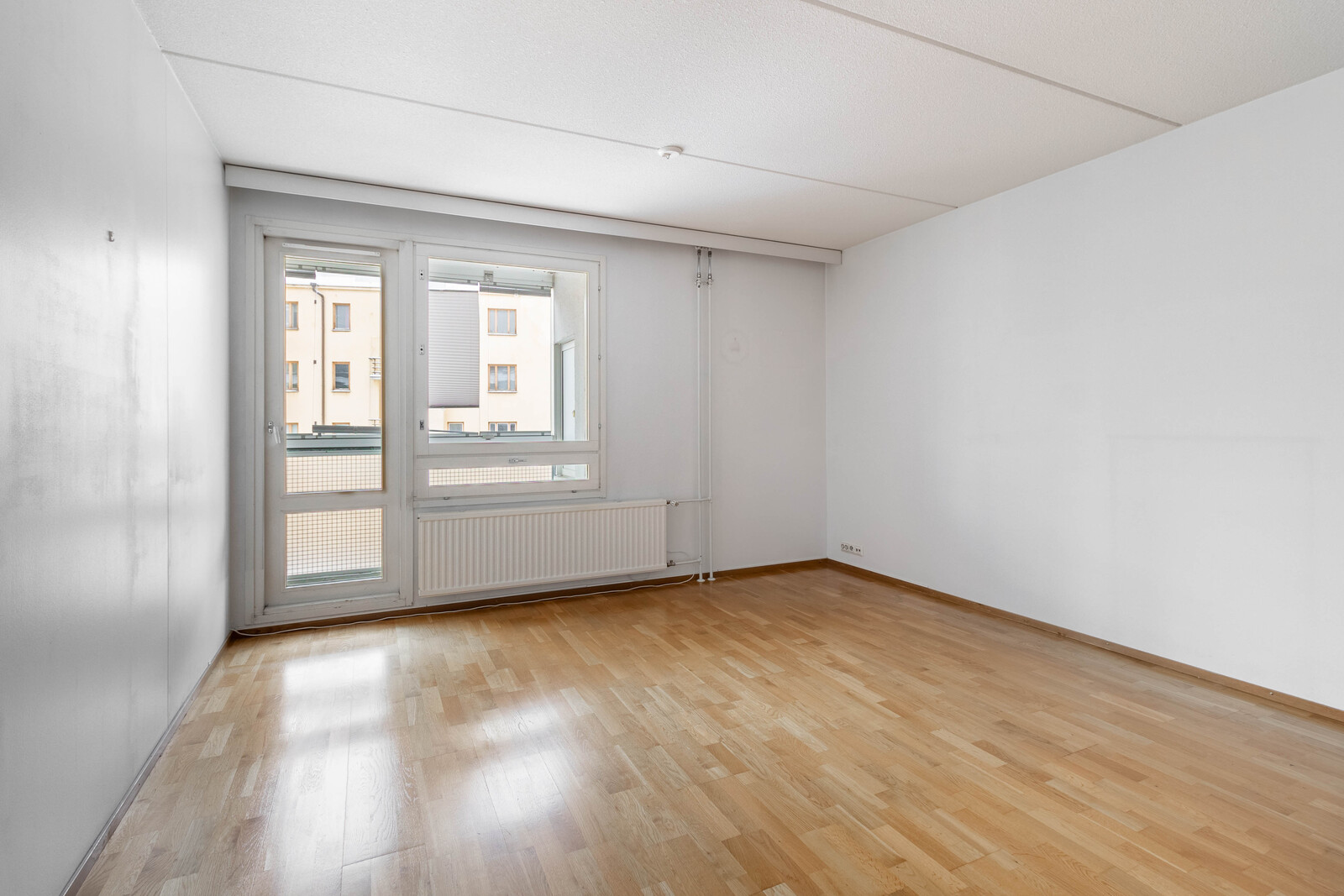 Tässä hissitalon kuudennen kerroksen asunnossa on tehokas pohjaratkaisu. Makuuhuone, jossa on hyvin säilytystilaa, näppärä keittokomero, olohuone, josta käynti lasitetulle parvekkeelle. Tilavalta parvekkeelta on näkymät taloyhtiön sisäpihalle.