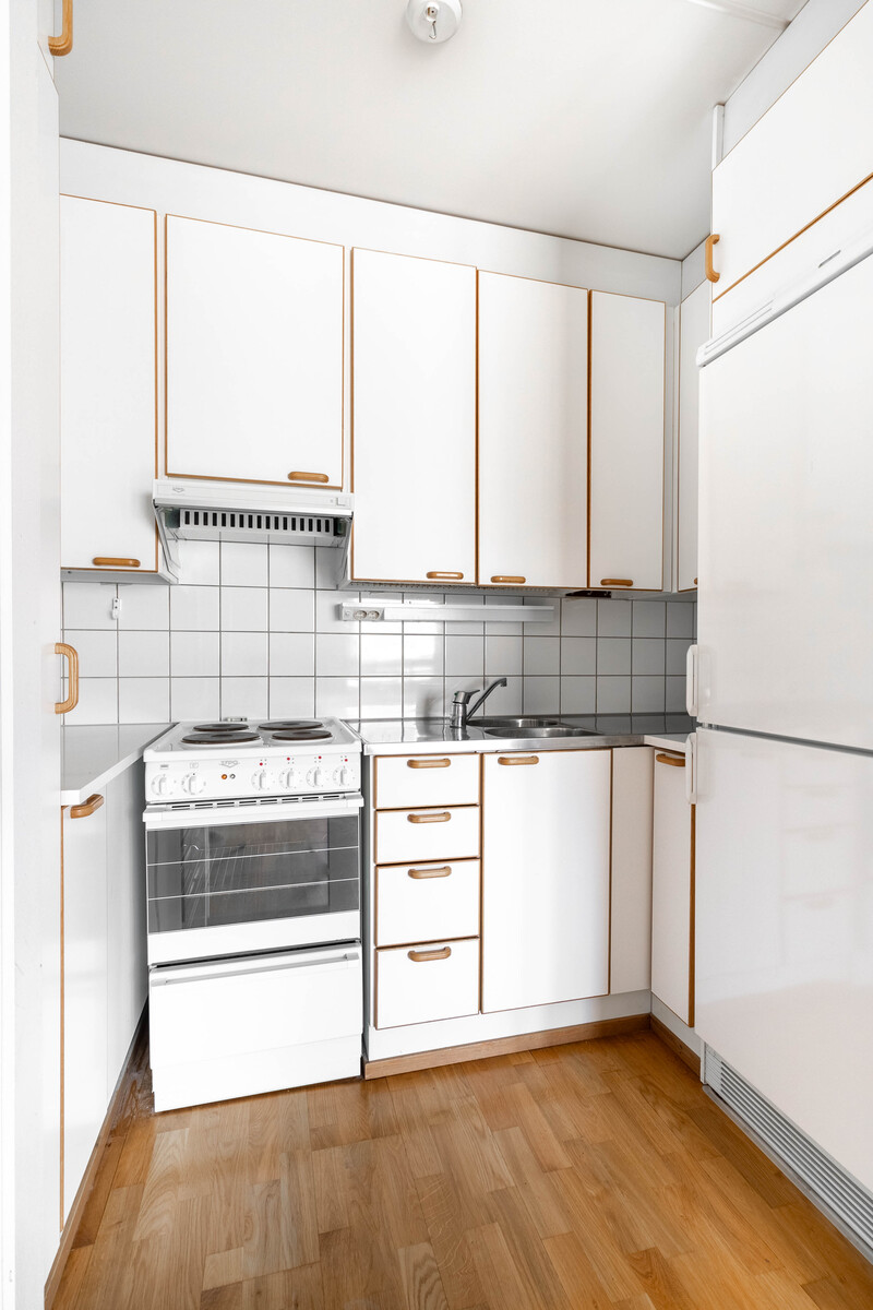Liesi (sähköliesi), seinät (maali), lattiat (parketti), jääkaappipakastin, liesi, liesituuletin ja kiinteät valaisimet |