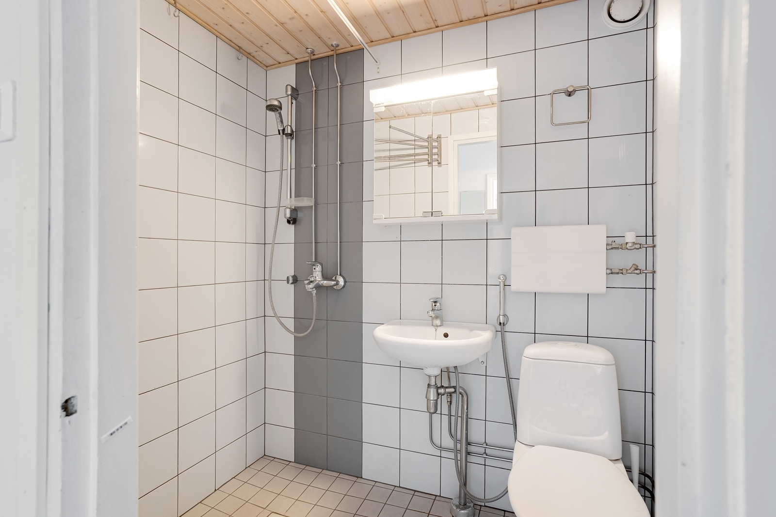 | Kylpyhuoneen kuvaus | Peilikaappi, pesukoneliitäntä, suihku, wc-istuin ja kiinteät valaisimet, seinät (kaakeli), lattiat (laatta) |
