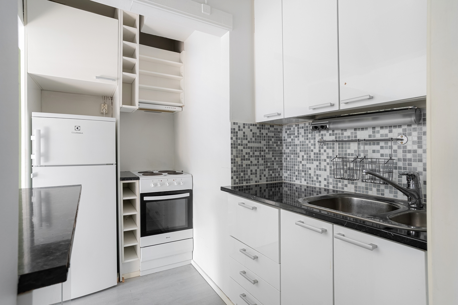 | Keittiön kuvaus | Liesi (sähköliesi), työtasot (laminaatti), seinät (maali), lattiat (laminaatti), jenkkikaappi (Kahva rikki), liesituuletin (Suodatin) ja liesi |