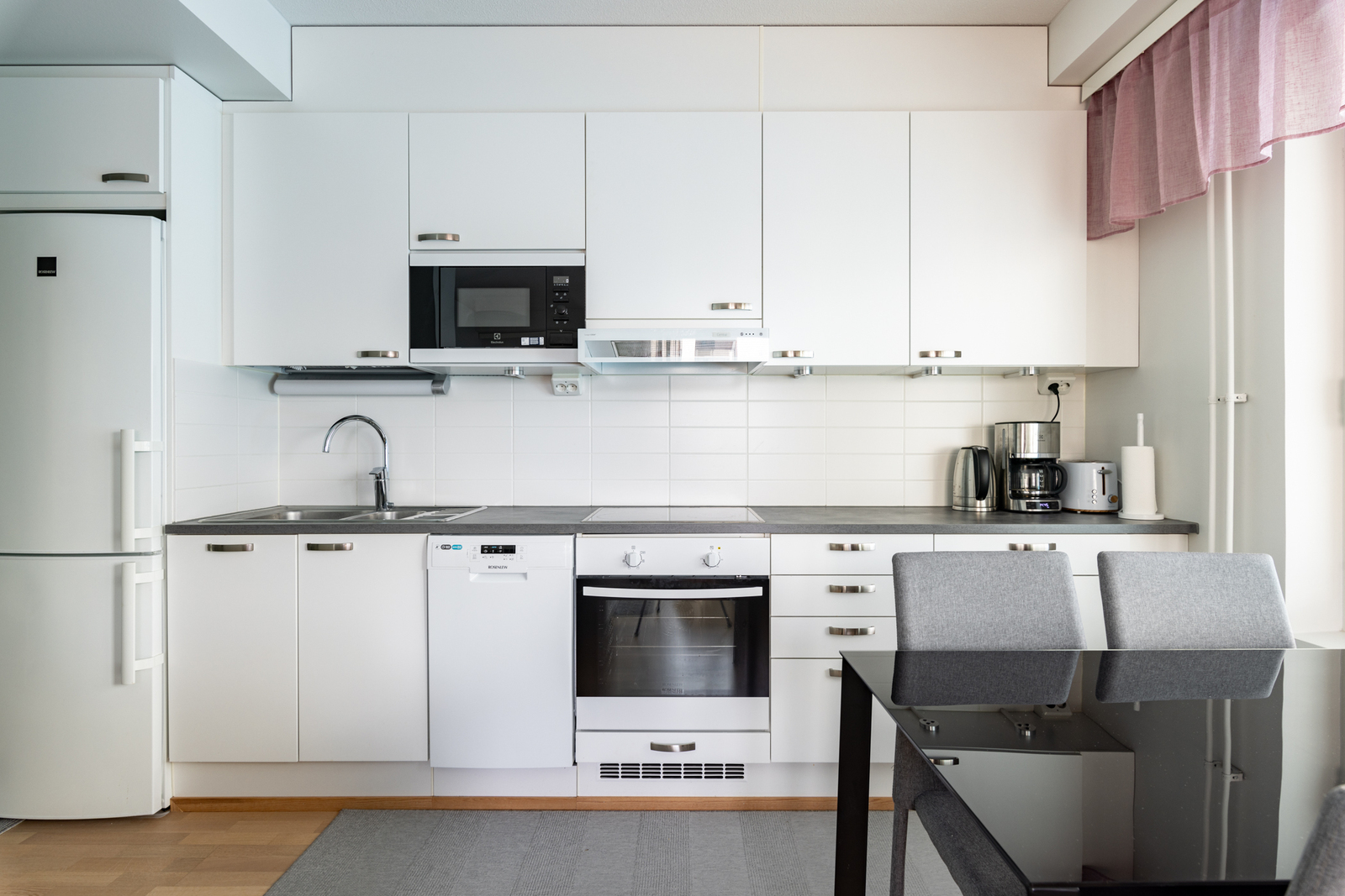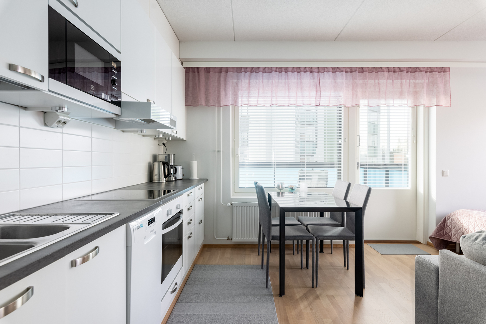 Liesi (Keraaminen liesi ja erillisuuni), seinät (maali ja osalaatoitus), lattiat (parketti), erillisuuni, jääkaappipakastin, mikroaaltouuni, liesituuletin, astianpesukone ja kiinteät valaisimet |