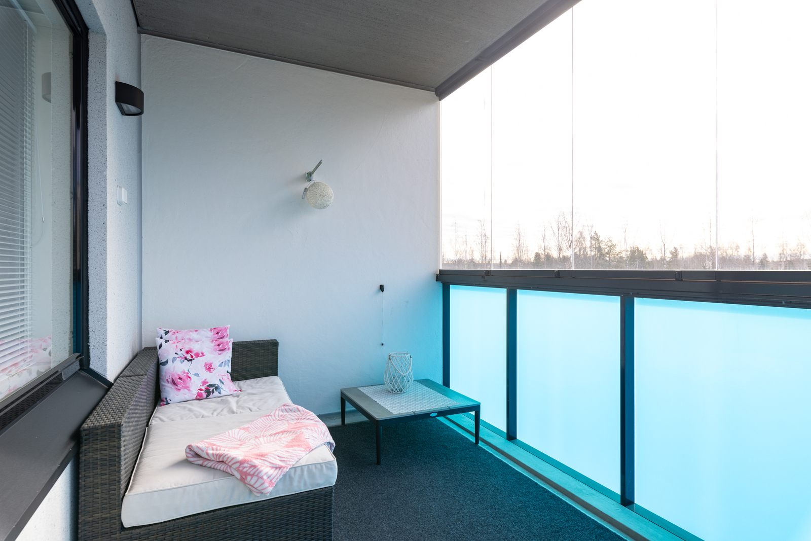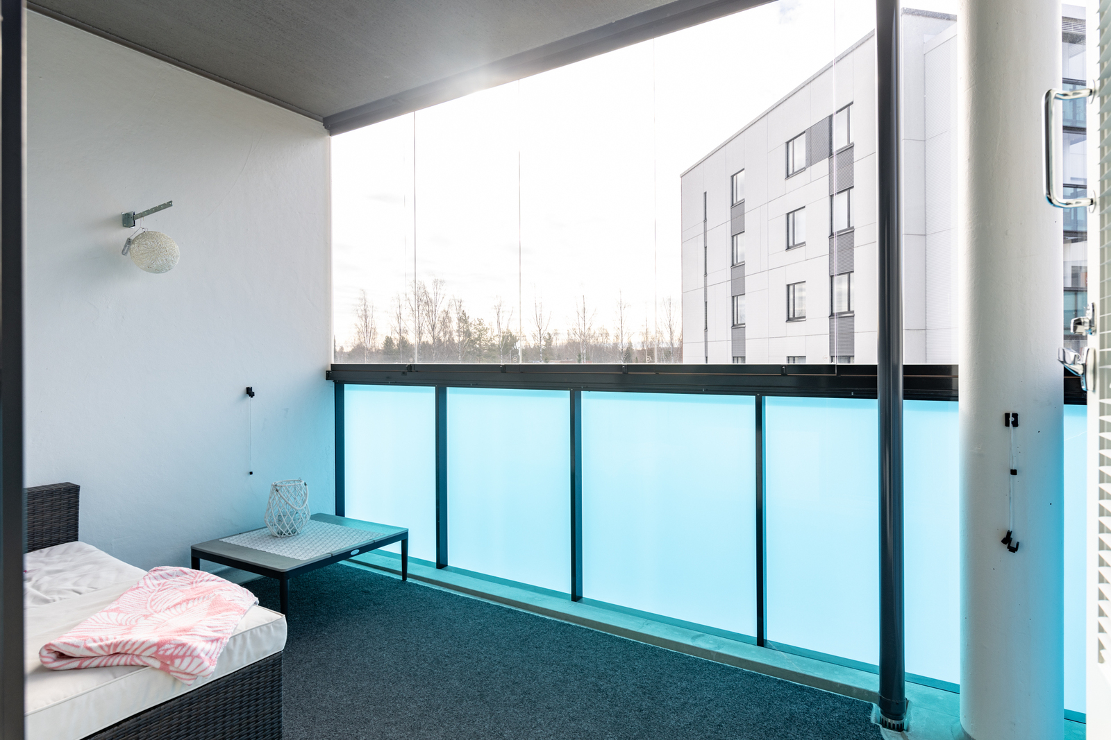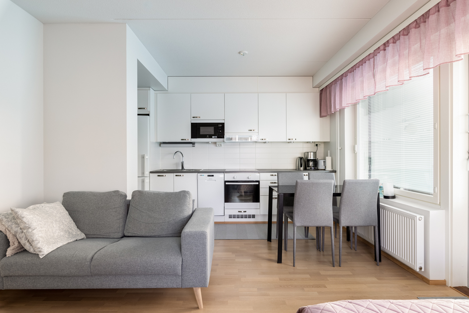 Tilava ja valoisa olohuone yhdistyy avoimesti tupakeittiöön ja lasitetulle parvekkeelle kuljetaan olohuoneen kautta. Kylpyhuone on tilava ja jäsennelty. Säilytystarpeita varten makuuhuoneessa ja eteisessä on kaapistot ja huoneistokohtainen varasto kellarissa.
