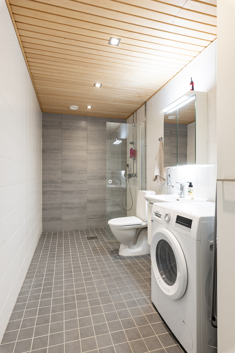 Suihku, suihkukaappi, lattialämmitys, suihkuseinä, wc-istuin, peilikaappi, pesukoneliitäntä ja kiinteät valaisimet, seinät (kaakeli), lattiat (laatta) |
