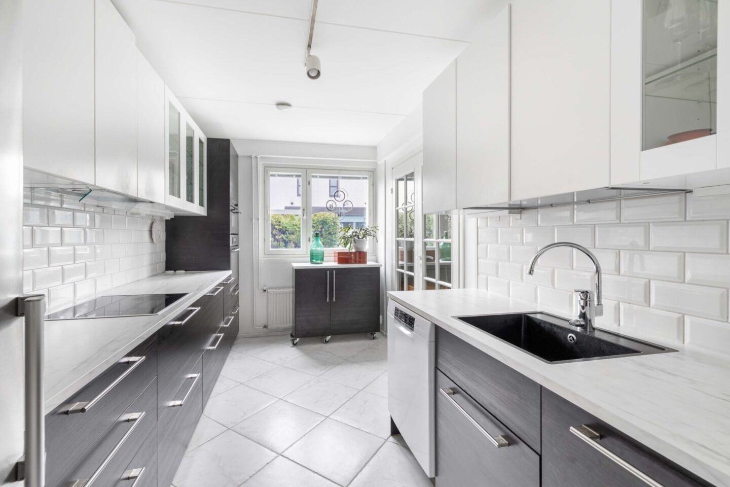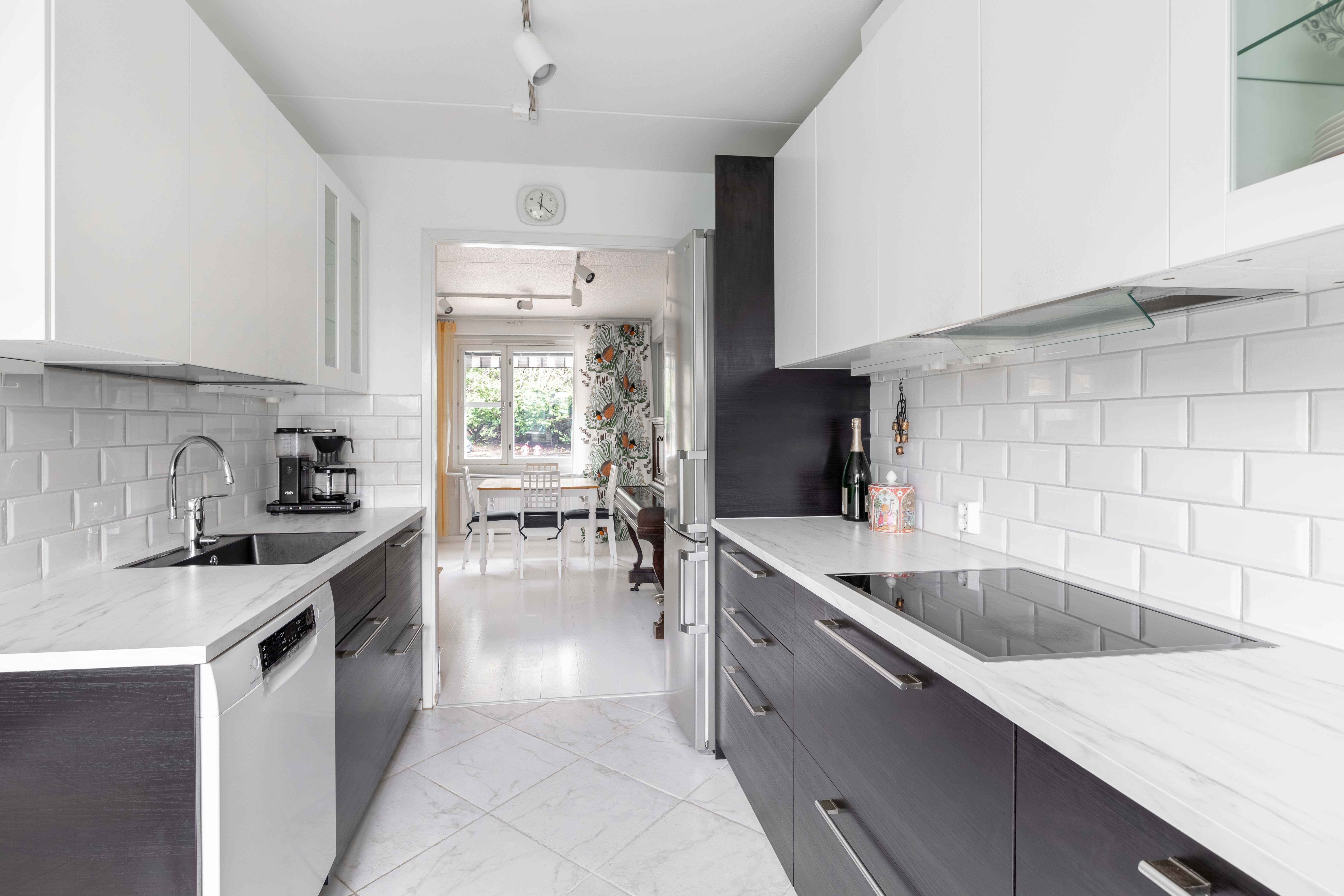Liesi (Induktioliesi), työtasot (laminaatti), seinät (maali), lattiat (laatta), mikroaaltouuni (integroituna ), erillisuuni (integroituna ), astianpesukone ja jääkaappipakastin |