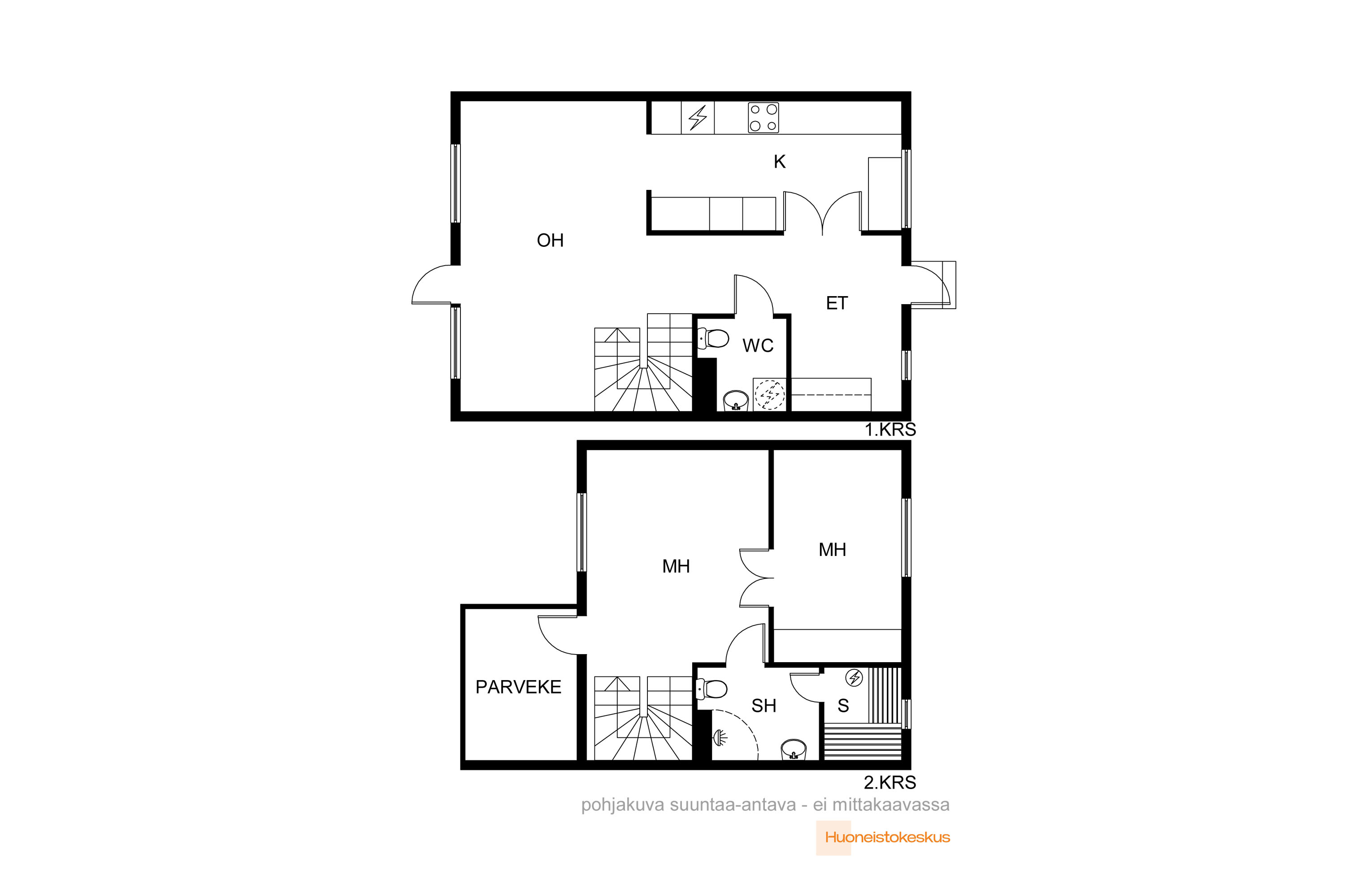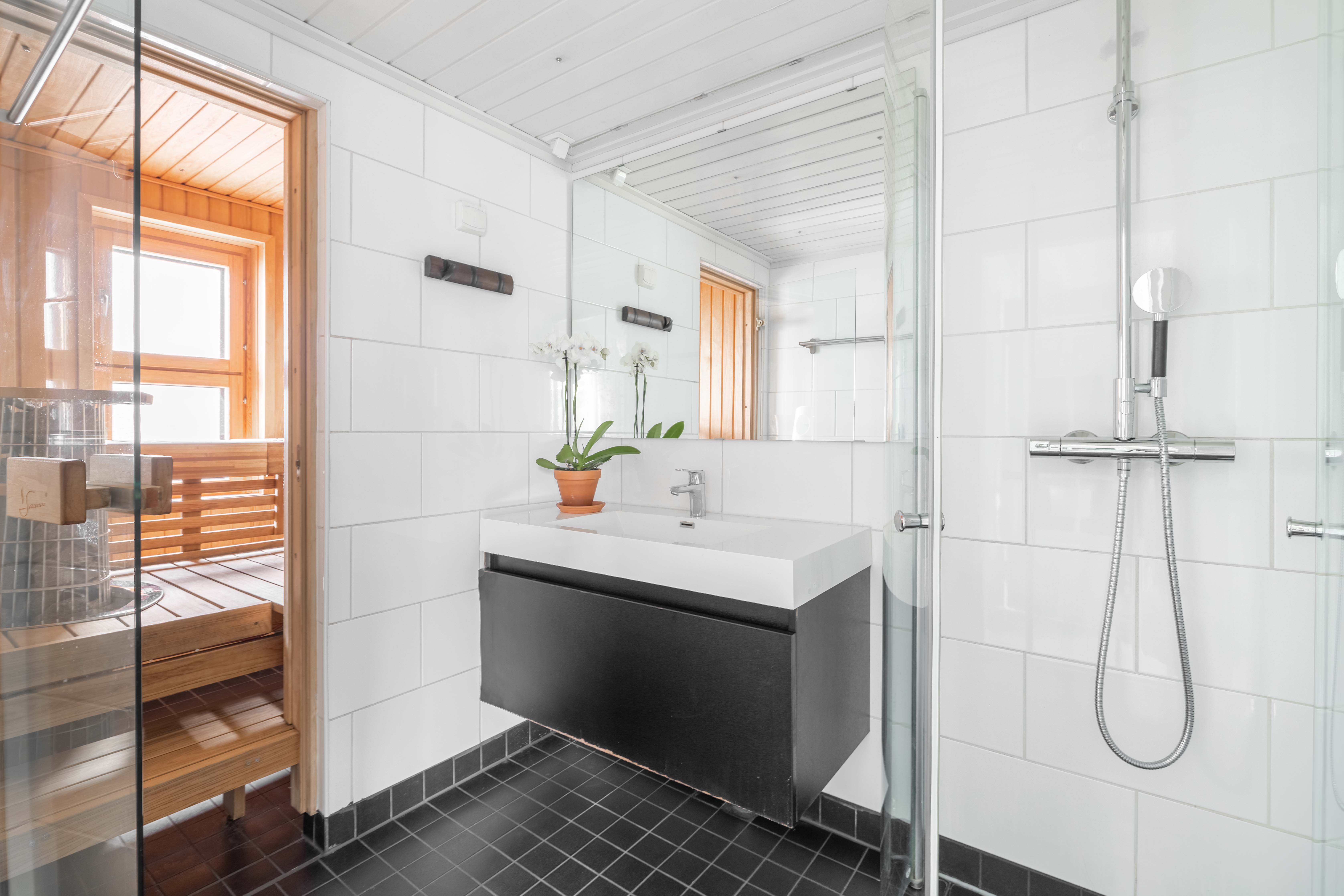 Sisääntulo avautuu avaraan eteiseen, josta kuljetaan moderniin keittiöön – kodin sydämeen. Tilavassa olohuoneessa vaalea parkettilattia tuo raikkautta ja avaruutta. Yläkerrassa tunnelmaa luo vinokatto, moderni kylpyhuone lattialämmityksellä sekä oma sauna. Lisäksi löytyy pieni parvi, joka sopii lukunurkkaukseksi tai lasten leikkipaikaksi.